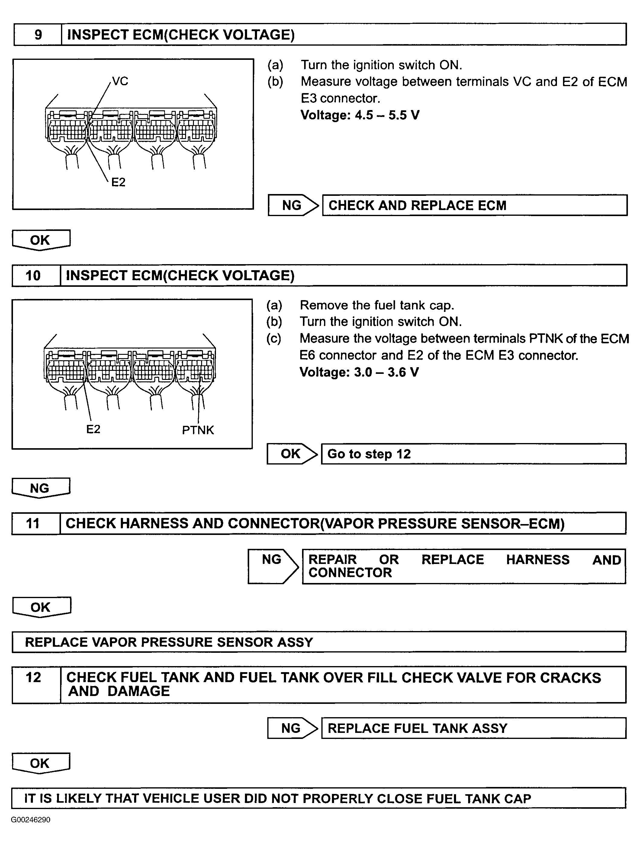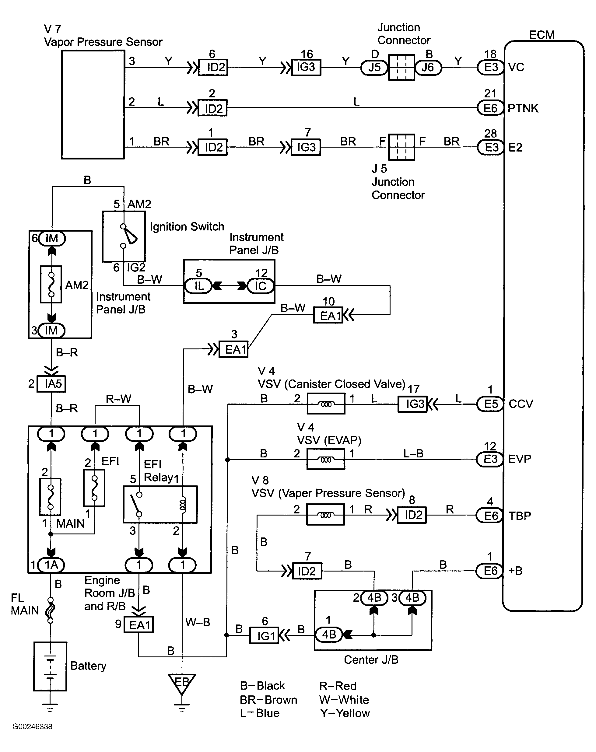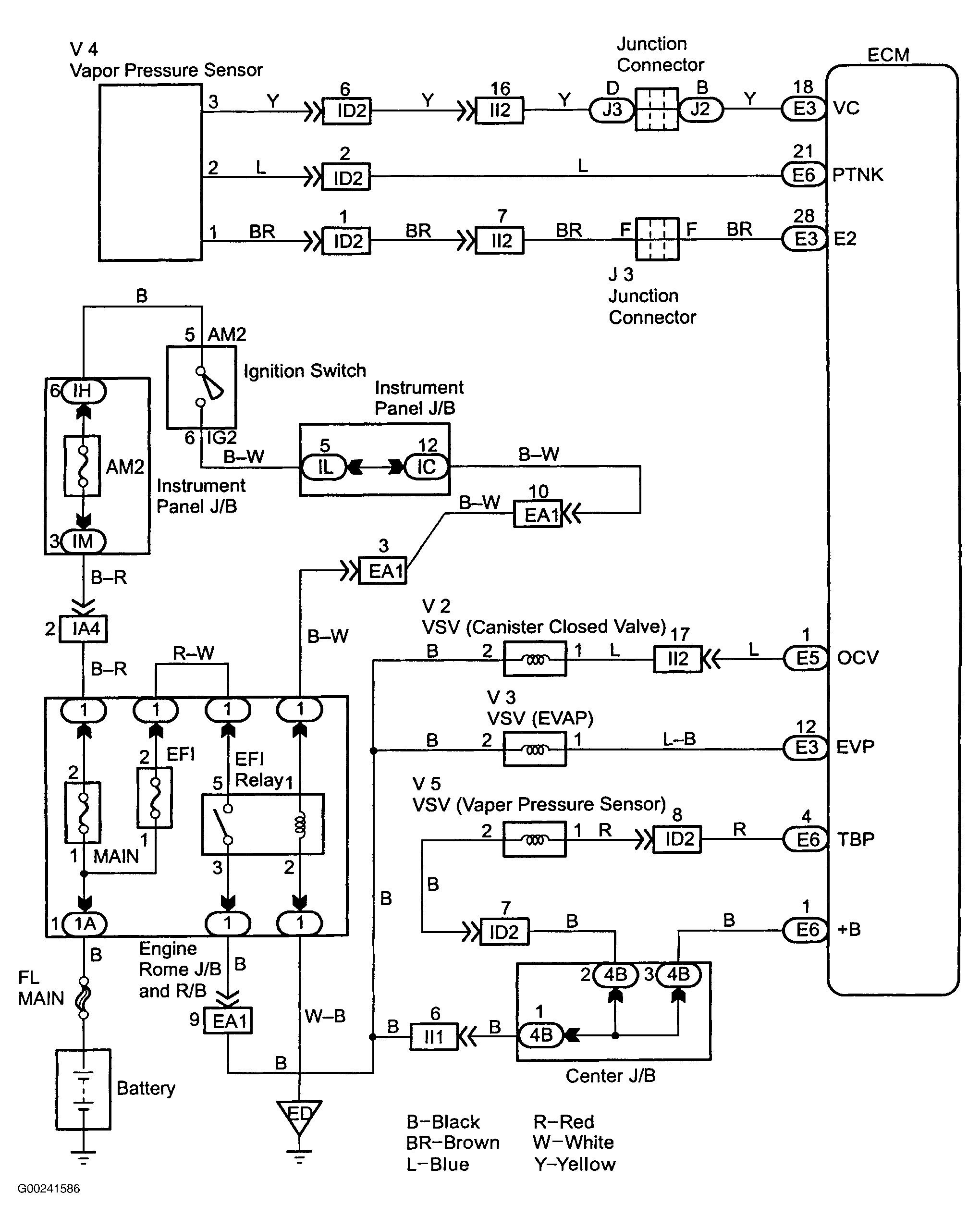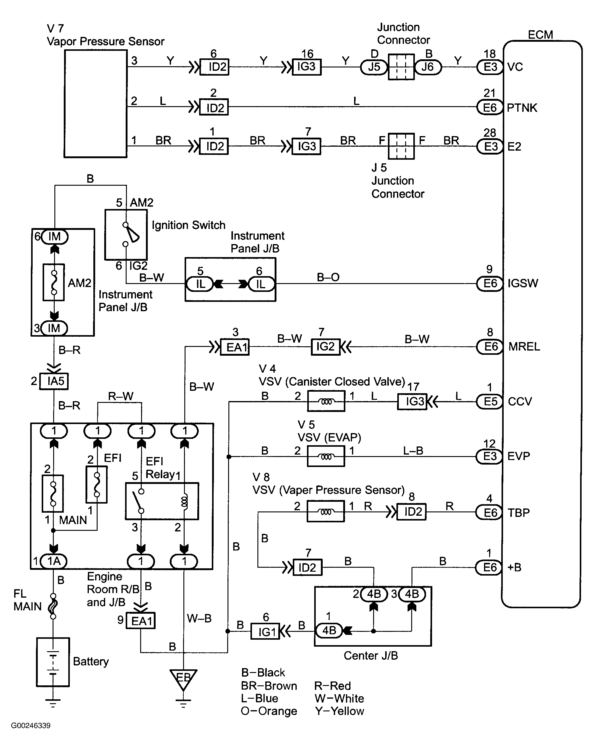 For wiring diagram of Corolla model, see Fig 1. For wiring diagram of Matrix (1ZZ-FE engine) model, see Fig 2. For wiring diagram of Matrix (2ZZ-GE engine) model, see Fig 3. For diagnosis and repair, see Fig 4-Fig 7. For testing of components, see SYSTEM & COMPONENT TESTING - 4-CYLINDER article. For removal and installation of components, see REMOVAL & INSTALLATION - 4-CYLINDER article. To check ECM inputs and outputs, see PIN VOLTAGE CHARTS article. To identify circuits referenced in testing, See ENGINE PERFORMANCE in SYSTEM WIRING DIAGRAMS article in ELECTRICAL.