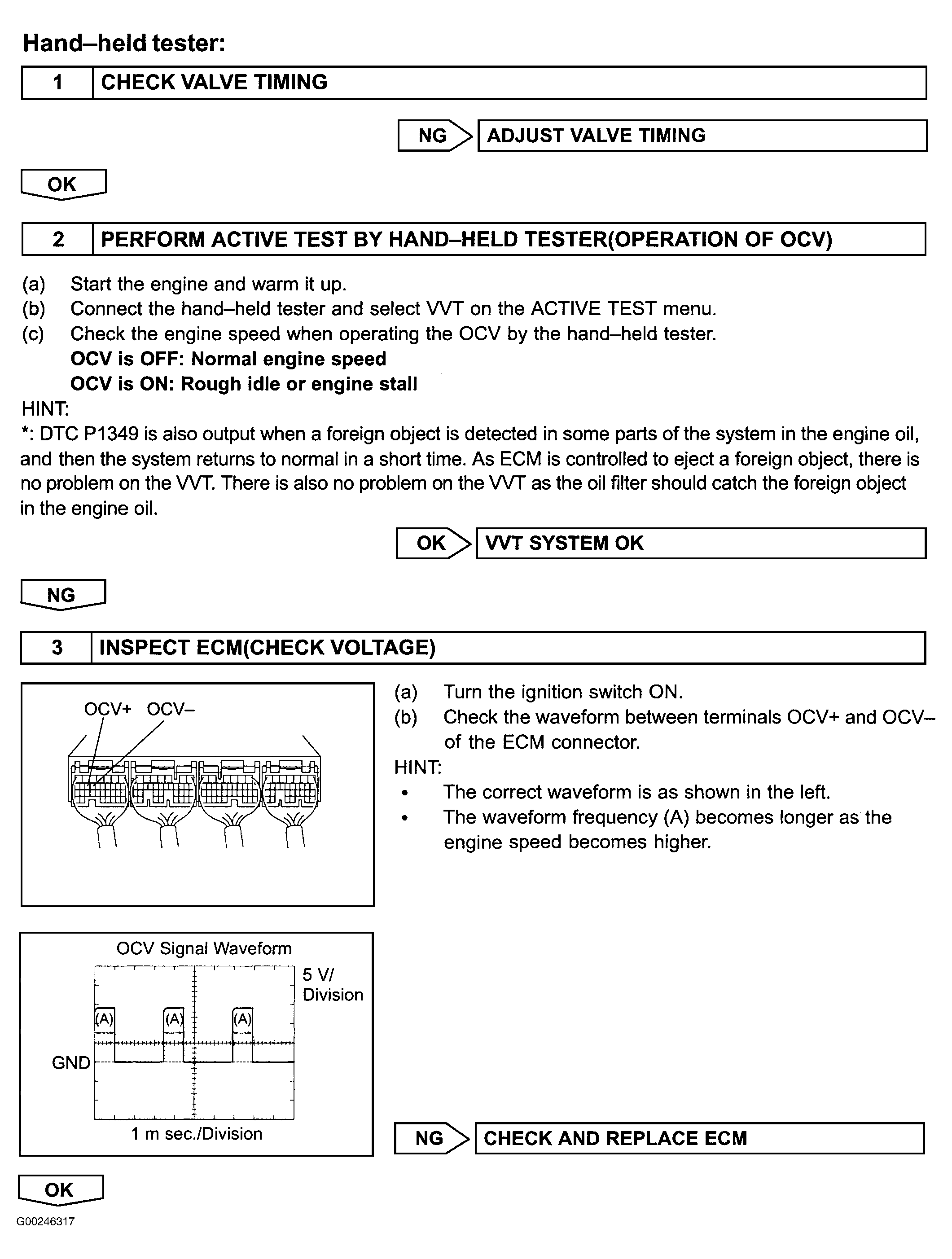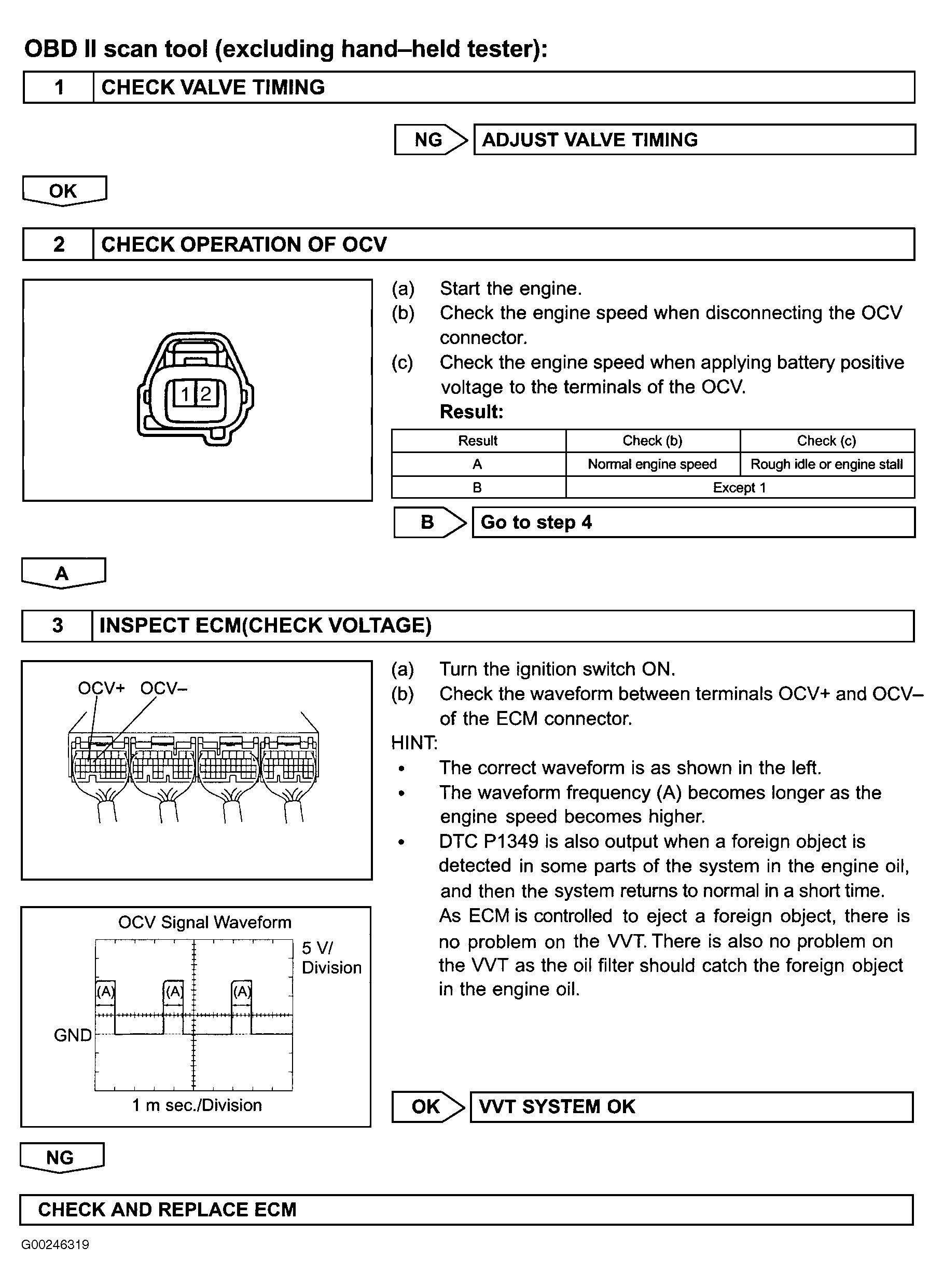 For wiring diagram, see Fig 1. For diagnosis and repair with hand-held tester, see Fig 2 and Fig 3 . For diagnosis and repair with OBD II scan tool, see Fig 4 and Fig 3 . For adjustments, see ON-VEHICLE ADJUSTMENTS - 4-CYLINDER article. To check ECM inputs and outputs, see PIN VOLTAGE CHARTS article. For removal and installation of components, see REMOVAL & INSTALLATION - 4-CYLINDER article. For testing of components, see SYSTEM & COMPONENT TESTING - 4-CYLINDER article.