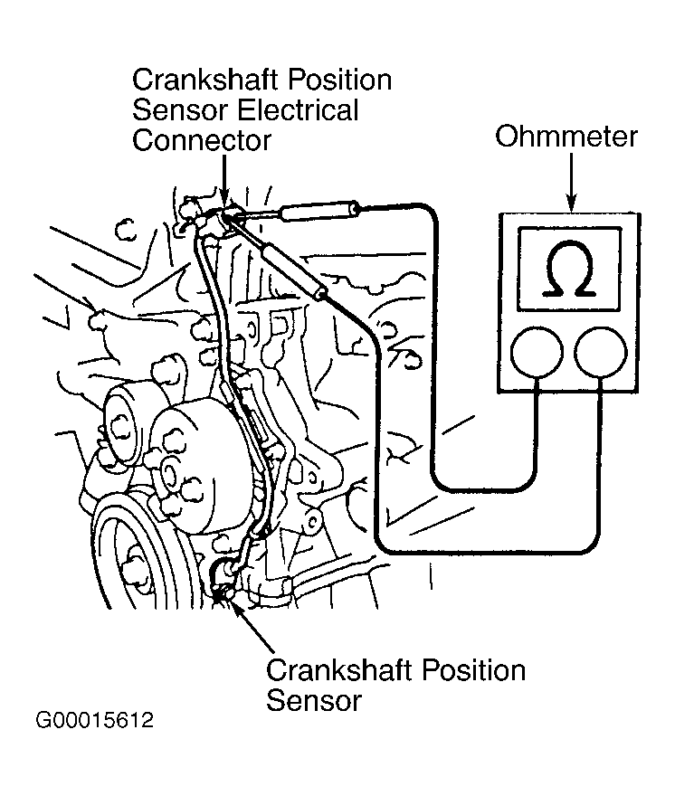 1. Disconnect crankshaft position sensor electrical connector located near front of engine. See Figure. Crankshaft position sensor is located on timing chain cover, near crankshaft pulley.