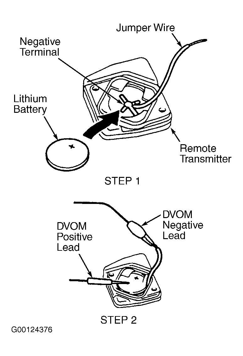 2. Using a DVOM, connect negative lead to jumper wire and place positive lead on positive terminal (top) of battery. See STEP 2 of Fig 1. Press and hold any button on remote transmitter for one second to place an electrical load on battery. Again press any button on remote transmitter and note voltage reading. If voltage is 2.1 volts or more, battery is okay. If voltage is not 2.1 volts or more, replace battery. See REMOTE TRANSMITTER BATTERY REPLACEMENT  under REMOVAL & INSTALLATION.