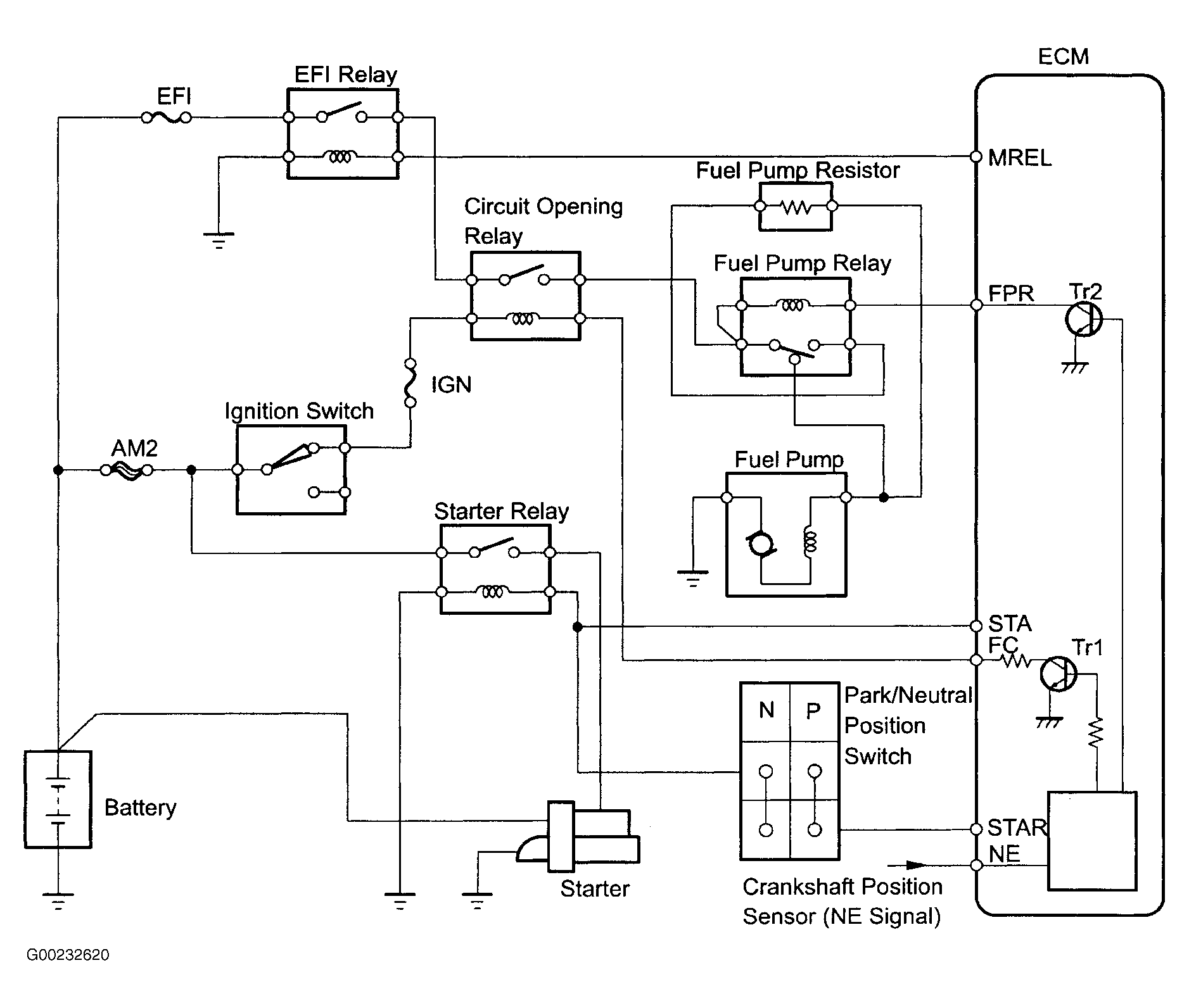 When the engine is cranked, current flows from ECM to the starter relay coil and also current flows to ECM (START) signal terminal. See Fig 1. When the START signal and ENGINE RUNNING signal from CKP are input to the ECM, transistor No. 1 (internal in ECM) is turned ON, current flows to the coil of the circuit opening relay, the relay switches on, power is supplied to the fuel pump, and the fuel pump operates. While the ENGINE RUNNING signal from CKP is generated, the ECM keeps transistor No. 1 (internal in ECM) ON (circuit opening relay ON) and the fuel pump keeps operating. The fuel pump speed is controlled at two levels (high speed or low speed) by the condition of the engine (starting, light load, heavy load). When the engine starts, transistor No. 2 (internal in ECM) is OFF, so the fuel pump relay closes and battery positive voltage is applied directly to the fuel pump. The fuel pump operates at high speed. After the engine starts during idling or light loads, since transistor No. 2 goes ON, power is supplied to the fuel pump via the fuel pump resistor. The fuel pump operates at low speed.
