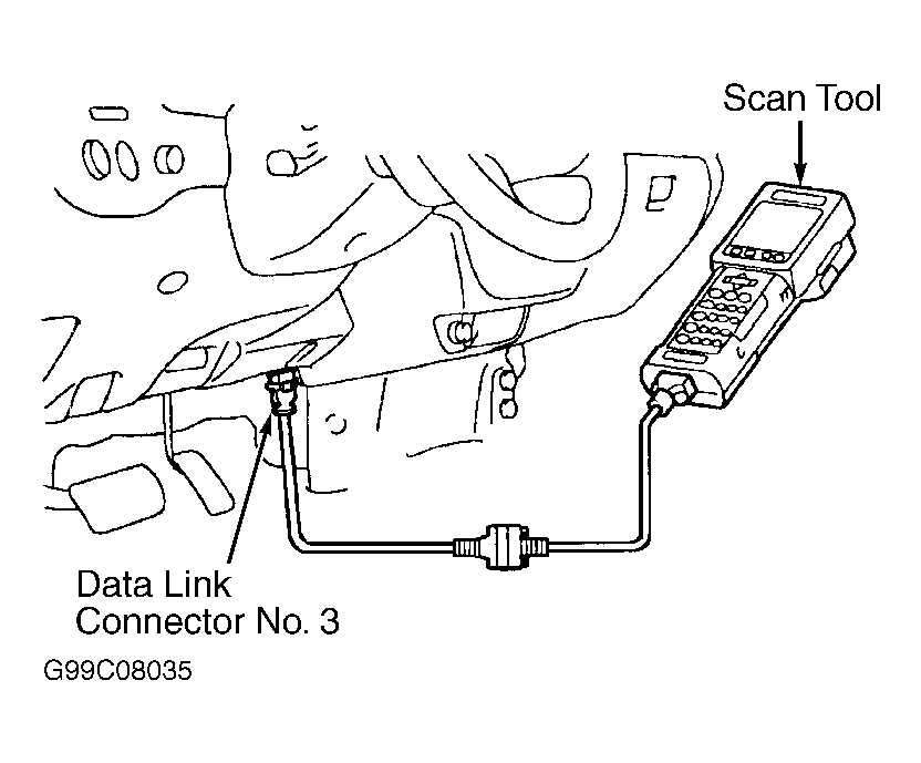 1. Connect Toyota hand-held tester or scan tool to Data Link Connector (DLC) No. 3 at driver's side of instrument panel. See Figure. Turn ignition on with engine off. Turn hand-held tester or scan tool on. Using hand-held tester or scan tool manufacturer's instructions, check for DTCs and freeze frame data.