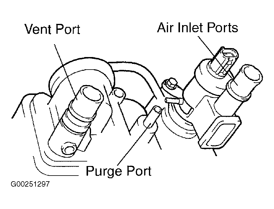 - Apply vacuum of 1.01 in. Hg (3.43 kPa) to vent port while holding lower air inlet port closed. Check that air is sucked into purge port. See Fig 1.