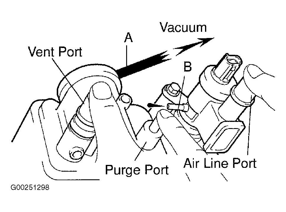 - If operation is not as specified, replace charcoal canister. Reinstall air hose between ports "A" and "B".