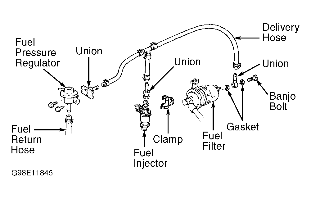 12. Using NEW gaskets, install fuel hose on top of fuel filter. Tighten union bolt to 21 ft. lbs. (29 N.m). Reinstall fuel pressure regulator. Install negative battery cable. Check for fuel leaks by operating the fuel pump by using hand-held tester or connecting battery voltage to fuel pump.