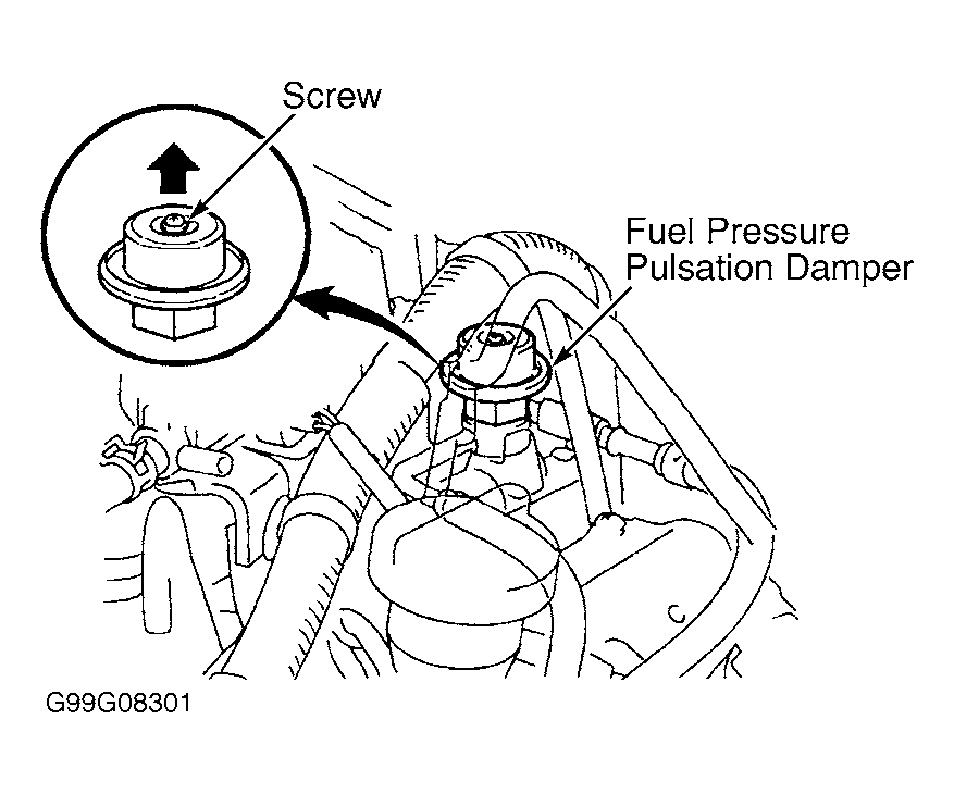 - Check operation of fuel pump by using Toyota hand-held tester. See FUEL PUMP OPERATION under FUEL SYSTEMS in BASIC DIAGNOSTIC PROCEDURES - V6 & V8 article. Ensure screw at center of fuel pressure pulsation damper rises upward when fuel pump is operated to indicate fuel pressure. Fuel pressure pulsation damper is located at firewall end of driver's side fuel rail. See Fig 1. If screw at center of fuel pressure pulsation damper does not rise upward when fuel pump is operated to indicate fuel pressure, go to step 4. If screw at center of fuel pressure pulsation damper rises upward when fuel pump is operated to indicate fuel pressure, go to step 11.