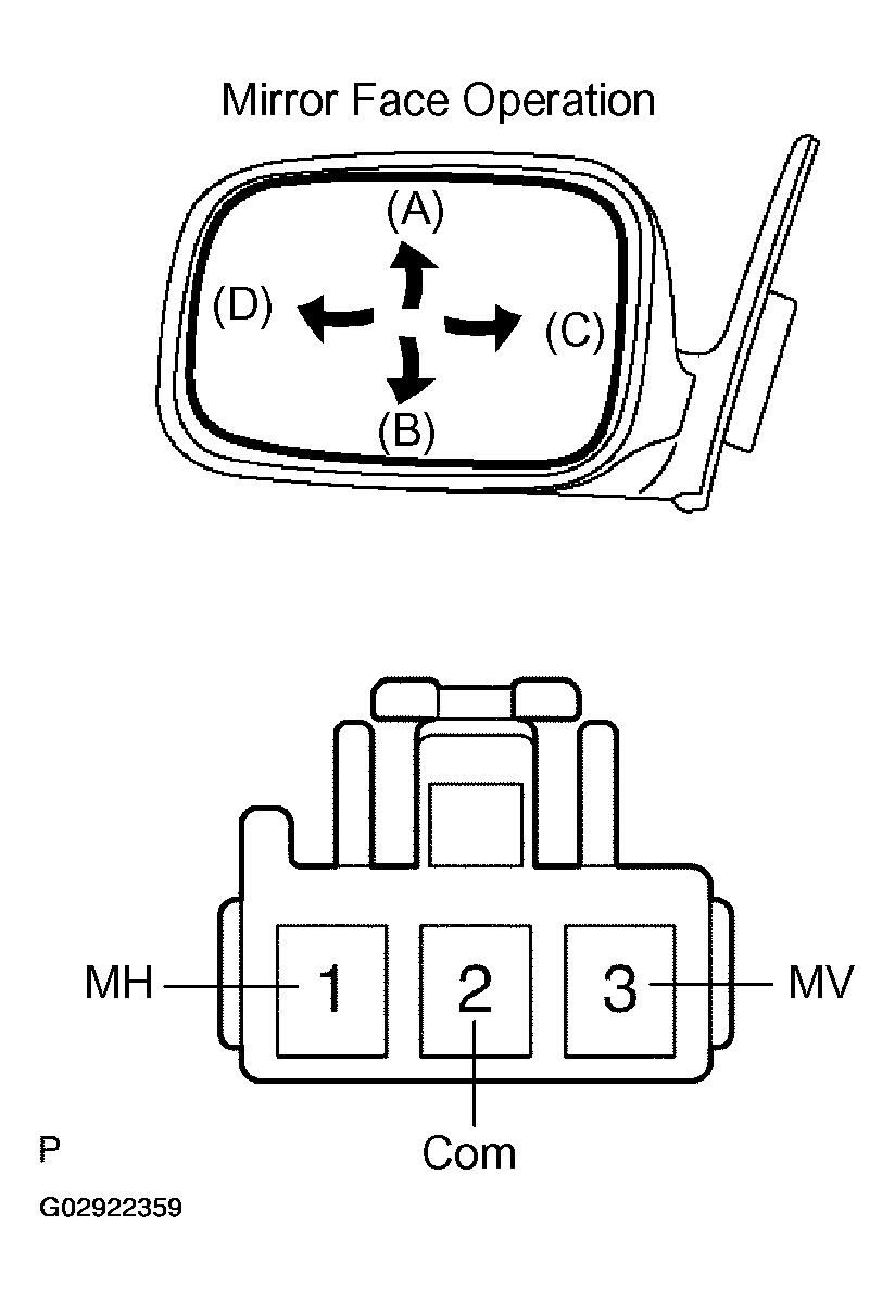 2. Apply battery voltage and inspect the mirror motor face operation, as shown in MIRROR POSITION  and Fig 3 .