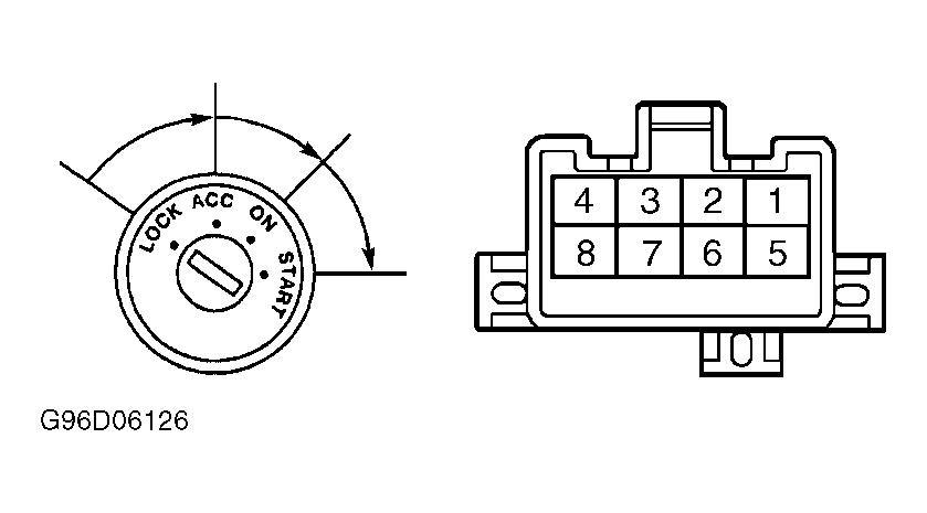 - With ignition switch in START position, there should be continuity between terminals No. 1, 2 and 4, and between terminals No. 6, 7 and 8. If continuity is not as specified, replace switch.