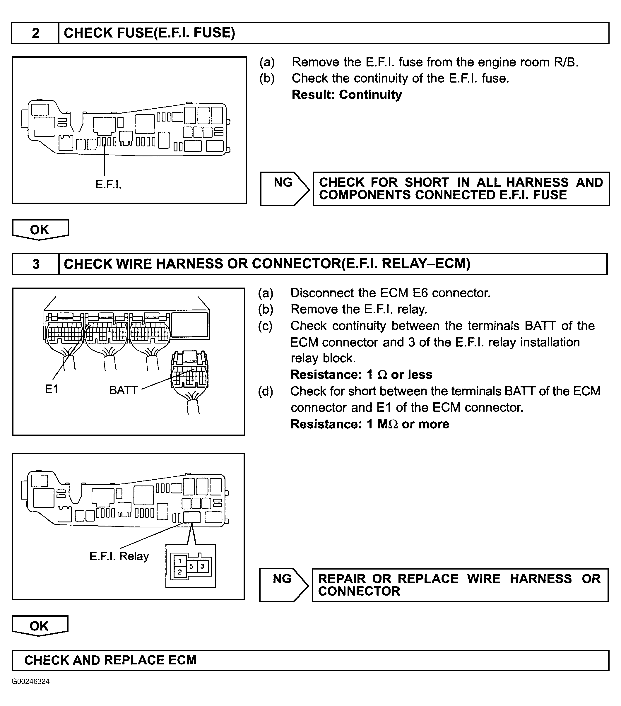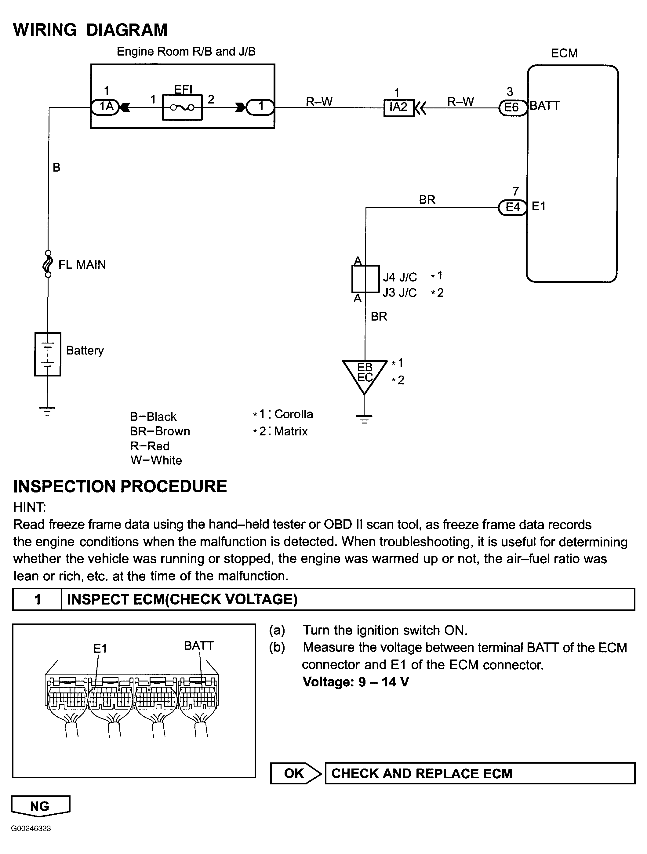 For diagnosis and repair, see Fig 1 and Fig 2 . To check ECM inputs and outputs, see PIN VOLTAGE CHARTS article. To replace ECM, see REMOVAL & INSTALLATION - 4-CYLINDER article. To identify circuits referenced in testing, See ENGINE PERFORMANCE in SYSTEM WIRING DIAGRAMS article in ELECTRICAL.