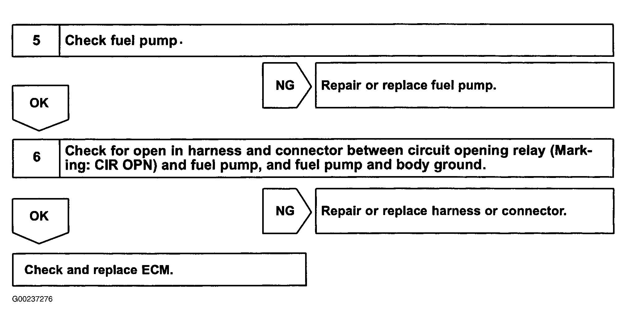 For fuel pump control circuit inspection and wiring diagram, see Fig 1-Fig 6 . Before replacing ECM, check ECM connectors and ground circuits. See ENGINE CONTROL MODULE POWER & GROUND CIRCUITS .