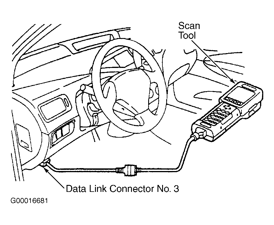 3. Connect Toyota hand-held tester or scan tool to data link connector No. 3 located at driver's side of instrument panel. See Figure. Hand-held tester or scan tool is used to read engine RPM. Warm engine to normal operating temperature.