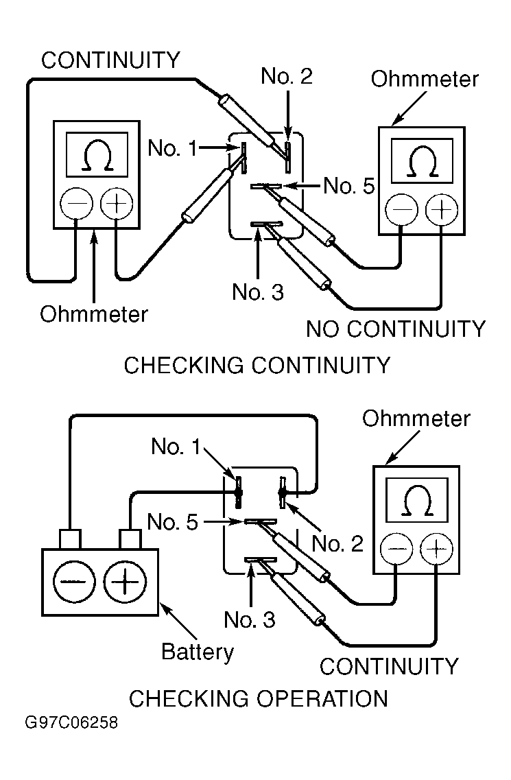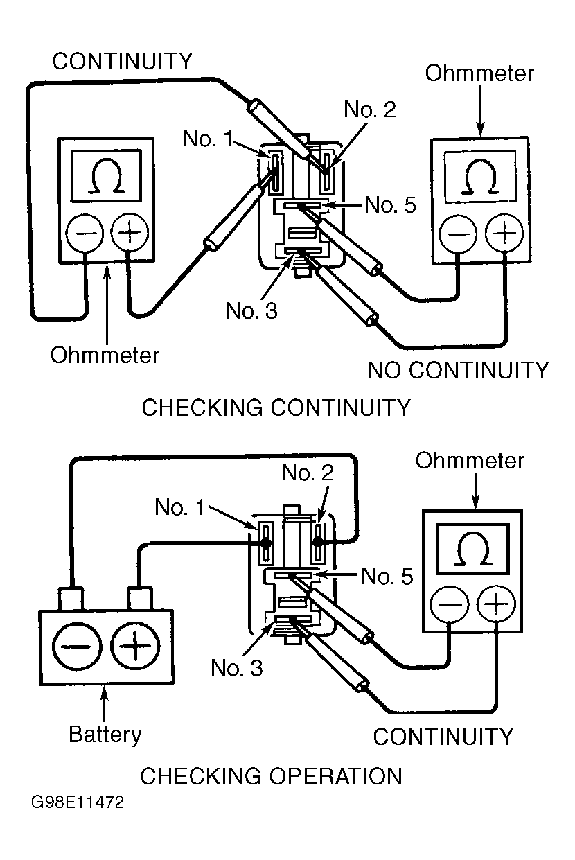 2. To test circuit opening relay, using ohmmeter, check for continuity or open between specified terminals on circuit opening relay. See Fig 11 and Fig 12 .