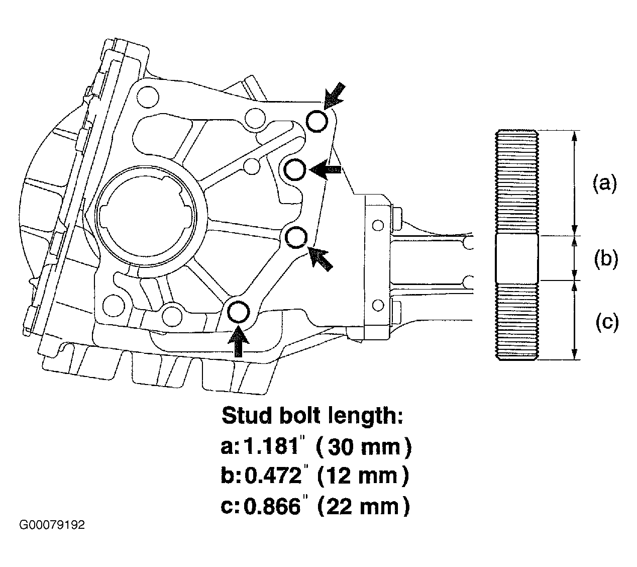 - Install transfer and transaxle setting stud bolt as follows: install the 4 stud bolts to the correct position. See Fig 5.NOTE: Install the transfer assembly to the transaxle assembly horizontally. Do not touch the oil seal part of the transfer assembly when installation.