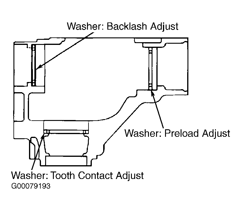 NOTE: When the washer thickness is changed, readjust the backlash. - Inspect tooth contact between ring gear and driven pinion using the following steps: