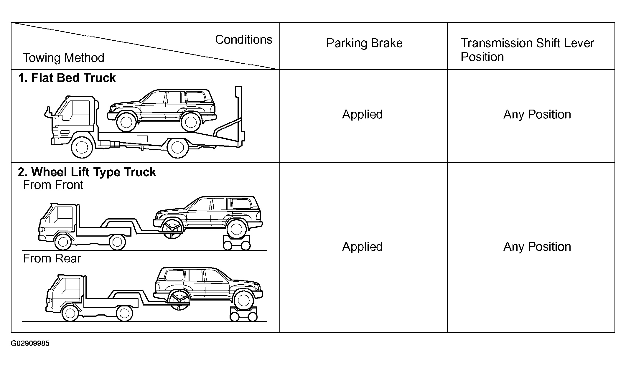 • If the vehicle has trouble in the chassis and drive train, use method 1 (flat bed truck).