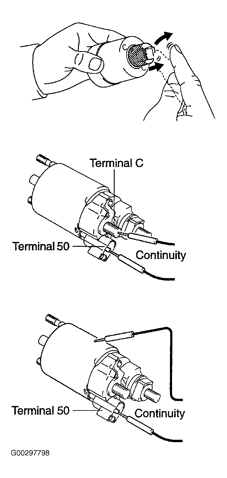 - Using an ohmmeter, check that there is continuity between terminals 50 and "C" with a resistance of less than one ohm. See Fig 1. If there is no continuity, magnetic switch.