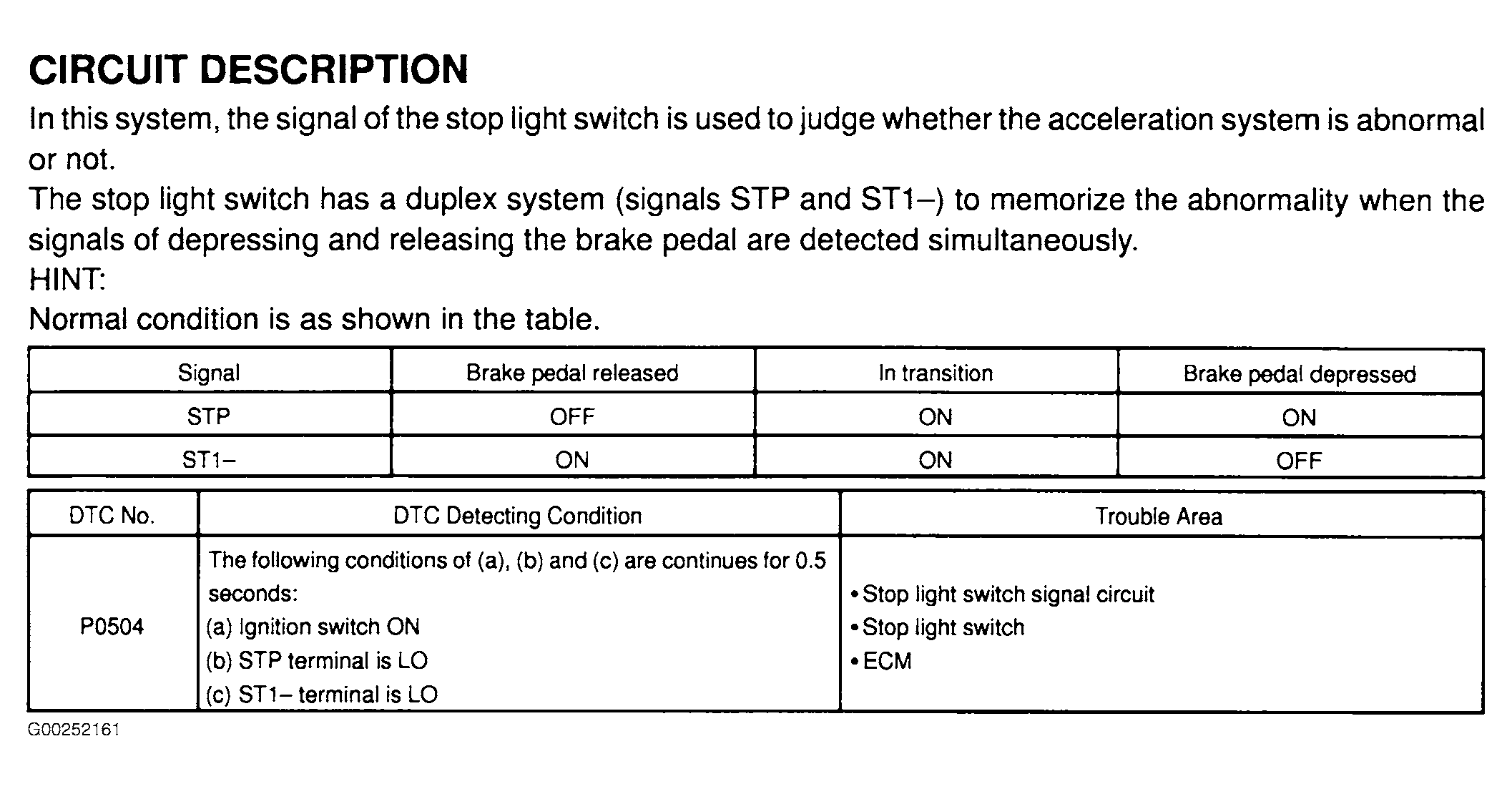Home >> Toyota >> 2004 >> Matrix Base, 4WD >> Repair and Diagnosis >> External Pages >> Different car >> Section 129 (Engine Control System Self Diagnostics) >> Diagnostic Tests >> DTC P0504: Brake Switch "A"/"B" Correlation >> Circuit Description & Possible Causes