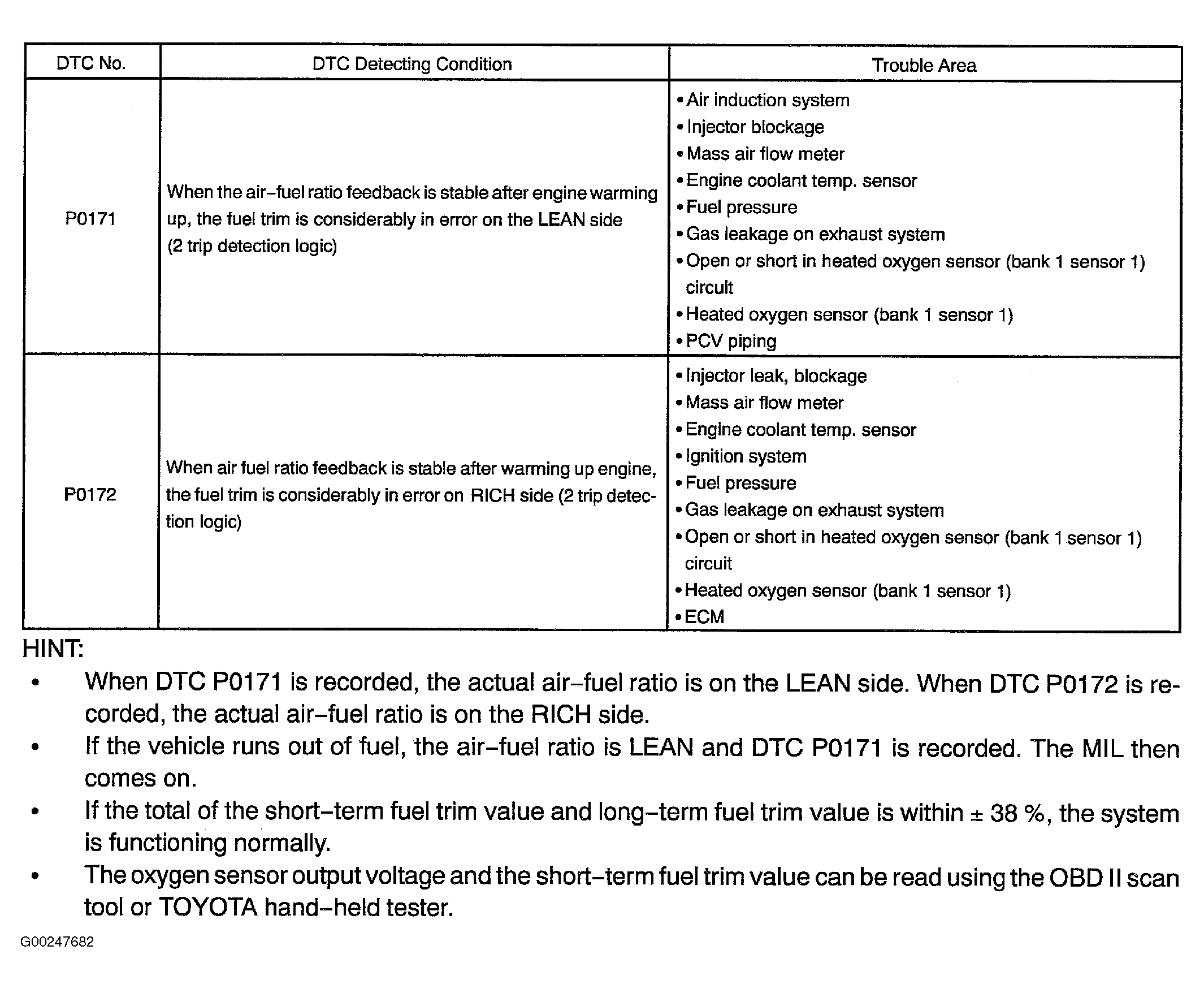 Home >> Toyota >> 2004 >> Matrix Base, 4WD >> Repair and Diagnosis >> External Pages >> Different car >> Section 131 (Engine Control System Self Diagnostics) >> Diagnostic Tests >> DTC P0171: System Too Lean Or DTC P0172: System Too Rich >> Possible Causes