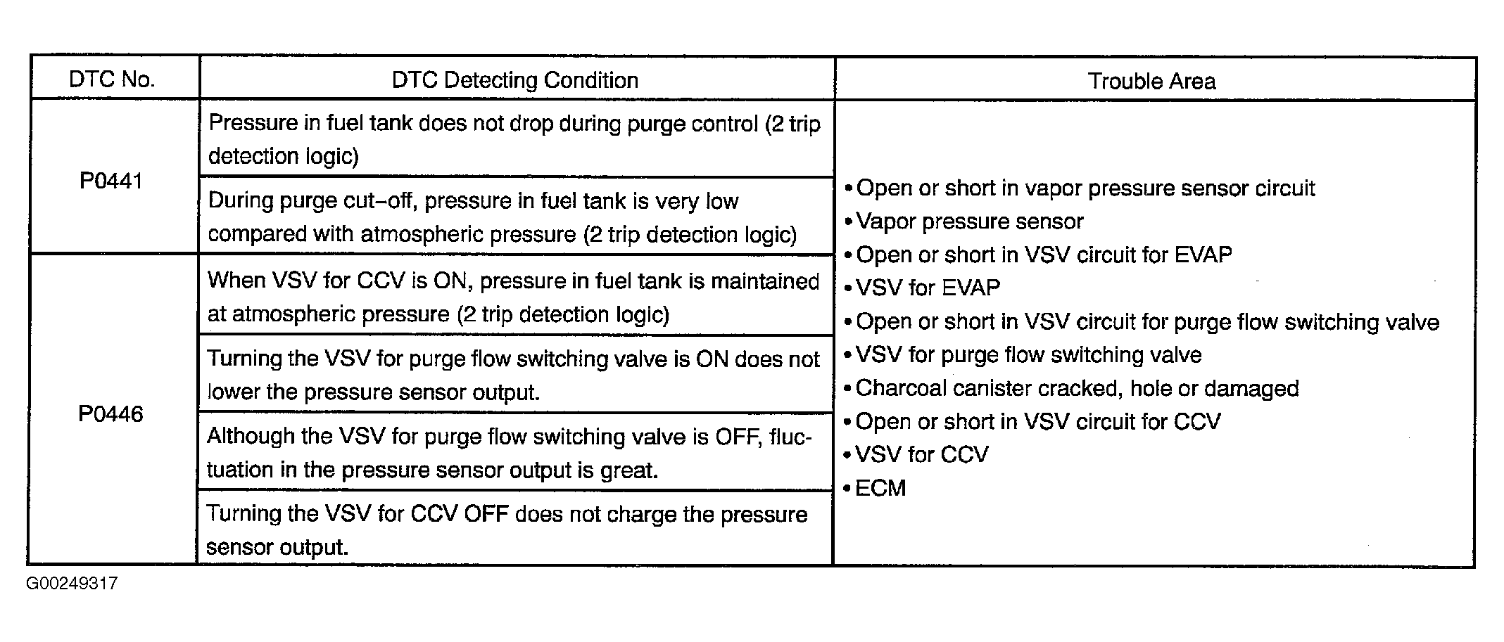 Home >> Toyota >> 2004 >> Matrix Base, 4WD >> Repair and Diagnosis >> External Pages >> Different car >> Section 131 (Engine Control System Self Diagnostics) >> Diagnostic Tests >> DTC P0441: EVAP Emission Control System Incorrect EVAP Purge Flow Or P0446: EVAP Emission Control System Vent Control Malfunction >> Possible Causes