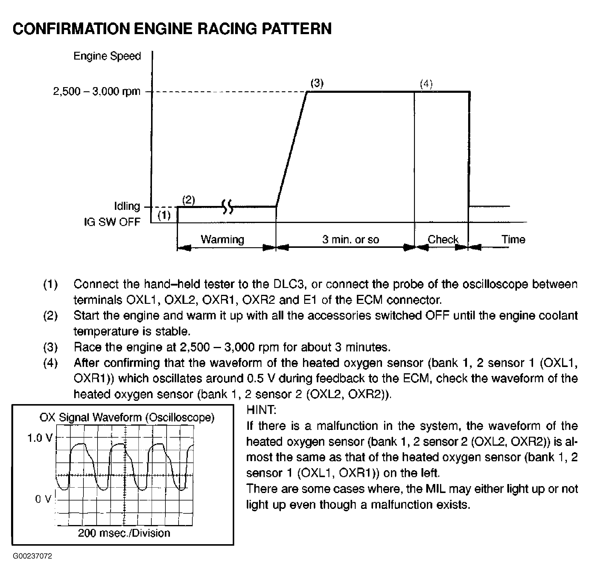 Home >> Toyota >> 2004 >> Matrix Base, 4WD >> Repair and Diagnosis >> External Pages >> Different car >> Section 133 (Engine Control System Self Diagnostics) >> Diagnostic Tests >> DTC P0420: Catalyst System Efficiency Below Threshold (Bank 1) Or P0430: Catalyst System Efficiency Below Threshold (Bank 2) >> Confirmation Engine Racing Pattern