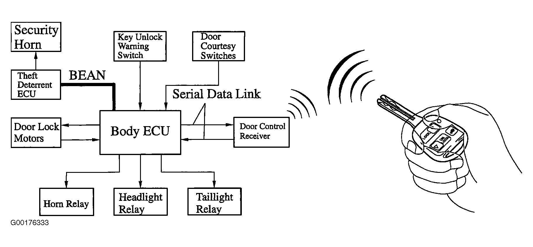 The wireless door control receiver performs the code identification process and the body ECU effects the door lock control. See Fig 1. Serial data link is provided for communication between the wireless door control receiver and the body ECU.