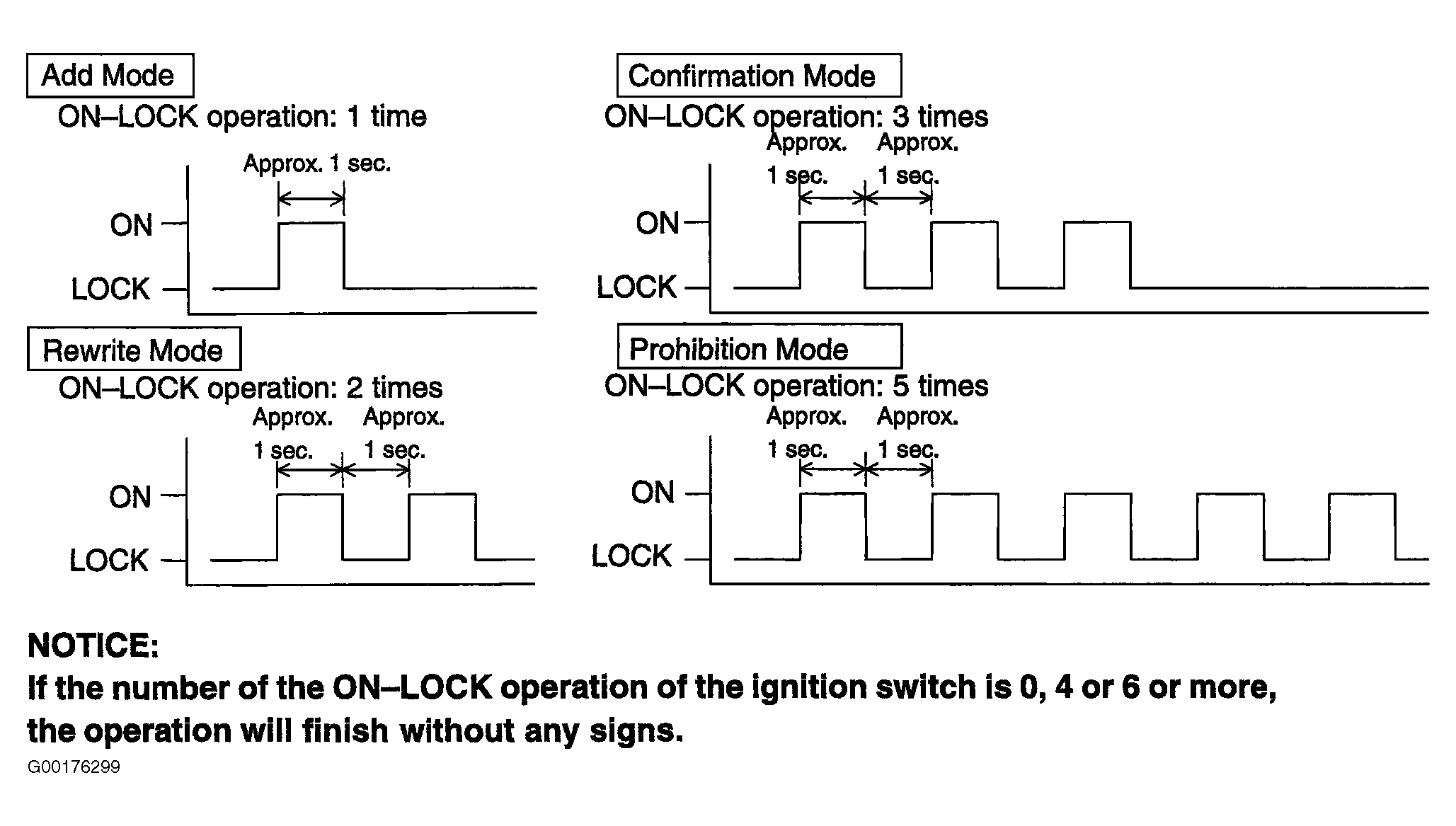 4. Turn the ignition switch from LOCK to ON and back to LOCK at approximately 1 second interval 1-5 times to select the mode. See Fig 1. Then remove the key from the ignition key cylinder.