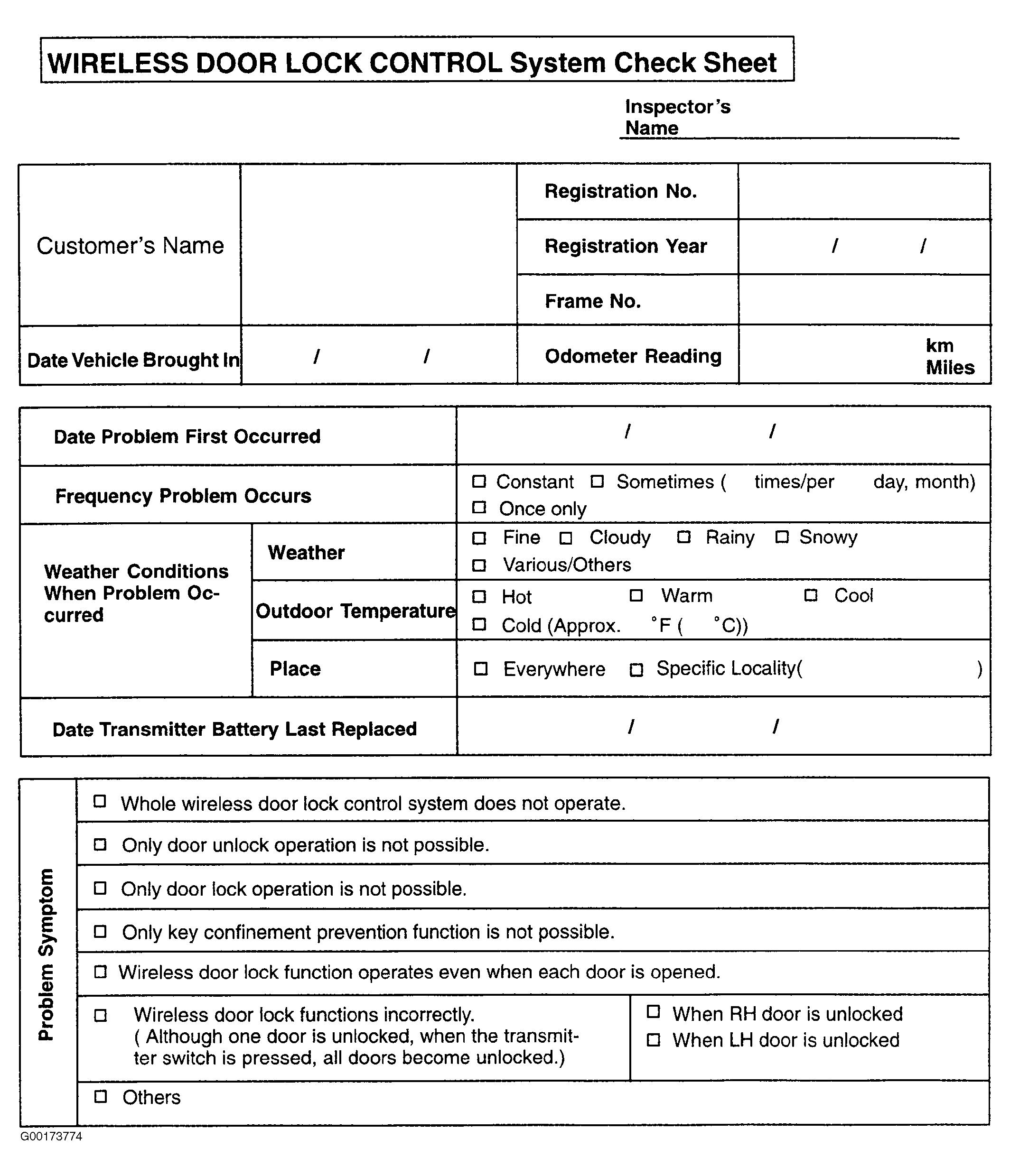 1. Trouble shooting of a remote keyless entry system complaint begins with verification of the customer problem. Perform the Customer Problem Analysis Check (Remote Keyless Entry System). See Fig 1.