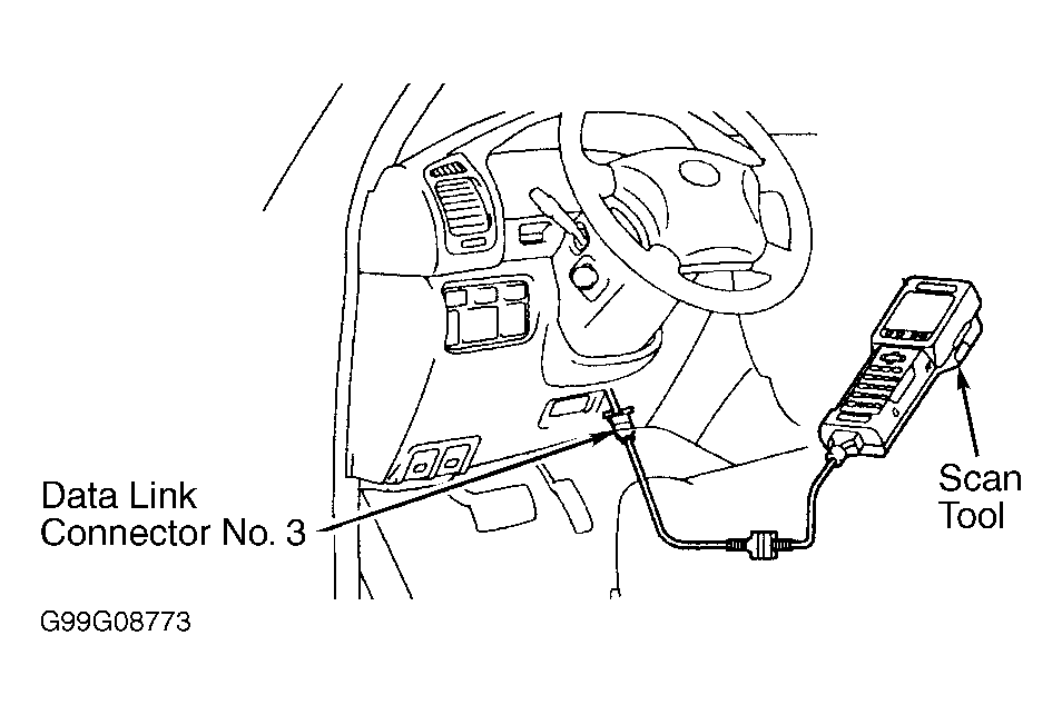1. When performing test drive confirmation, procedures must be performed exactly as listed or the malfunction may not be detected. Connect Toyota hand-held tester or scan tool to Data Link Connector (DLC) No. 3 at driver's side of instrument panel. See Figure. Check for any DTCs and read FREEZE FRAME data. Record DTCs and freeze frame data. If using hand-held tester, switch hand-held tester to CHECK mode.