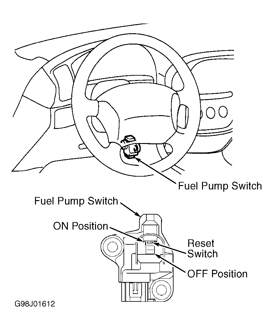 NOTE: Before performing this test procedure ensure reset switch on fuel pump switch is in the ON position. Fuel pump switch is located on driver's side of instrument panel. See Fig 1. Fuel pump switch may also be referred to as fuel pump inertia switch or fuel pump control switch.