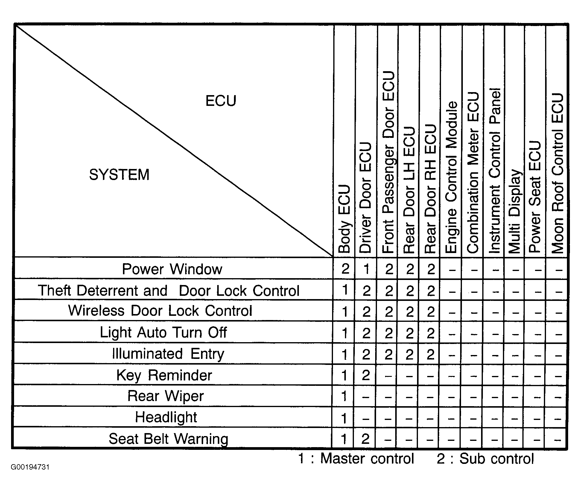 The system is comprised of the communication modes of the body ECU, driver door ECU, front passenger door ECU, LH rear door ECU, RH rear door ECU, engine control module, combination meter ECU, multi display, instrument control panel, power seat ECU and moon roof control ECU. The body electrical systems are controlled by a serial communication in which each ECU is linked to another via a single communication line. This system is also equipped with a self-diagnosis function. The table below shows the systems under the control of the multiplex communication system and related ECUs (communication nodes). See Fig 1.