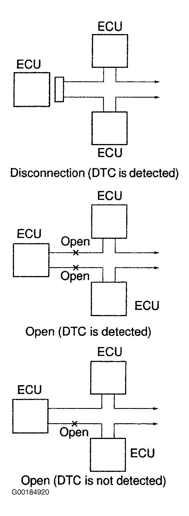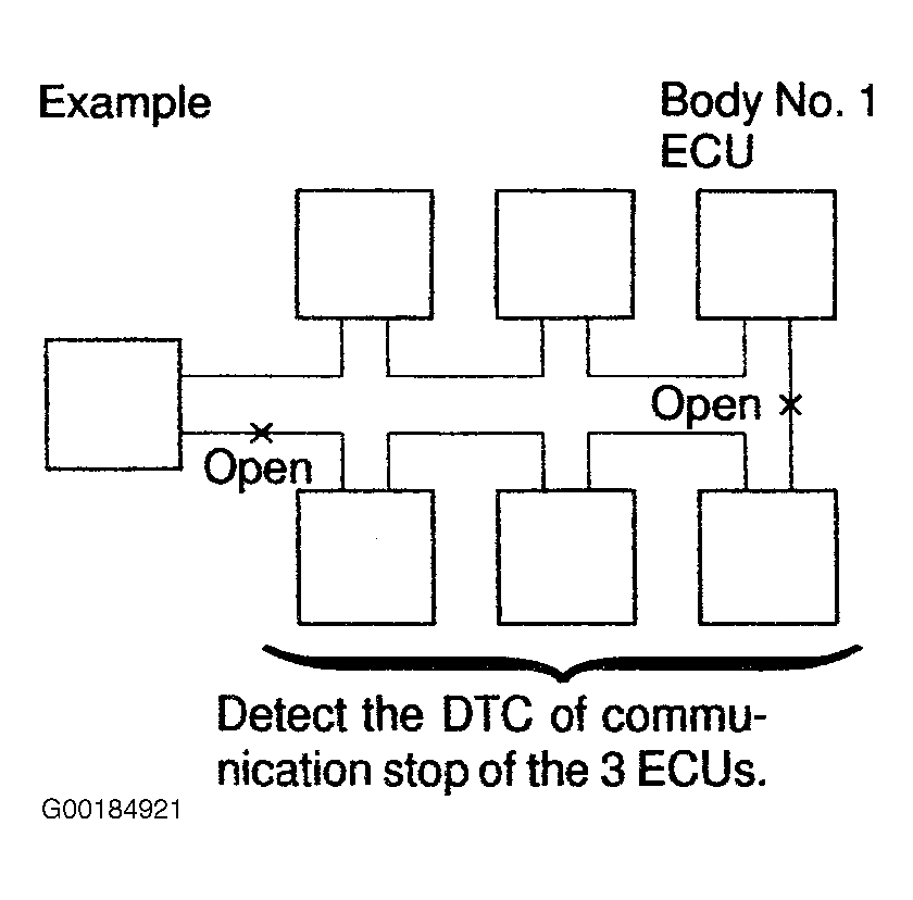 • If the DTC of the ECU communication stop is output, there is a possibility of connector disconnection or 2 communication buses open. See Fig 1. It will not become abnormal with only 1 communication bus open.