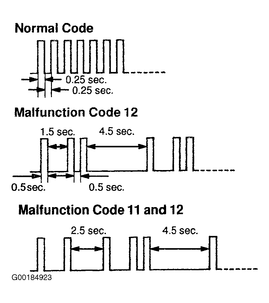 2. Turn the ignition switch ON and read the DTC on the open door indicator light. As an example, the blinking patterns for codes; normal, 12, and 11 and 12 are shown in the illustration. See Fig 2.