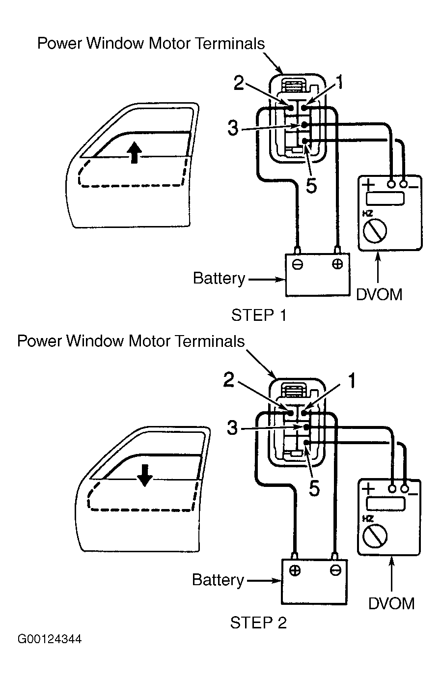 Disconnect power window motor 6-pin electrical harness connector. Connect Toyota electrical tester (DVOM) positive lead to terminal No. 3 and negative lead to terminal No. 5 of power window motor. Apply battery positive voltage to terminal No. 1 and battery negative voltage to terminal No. 2 of power window motor. See STEP 1 in illustration. See Fig 1. Pulse should be generated while power window motor turns. Reverse polarity of battery leads. See STEP 2 in illustration. See Fig 1. Pulse should be generated with power window motor turning in opposite direction. If pulse is not generated as specified, replace power window motor. See POWER WINDOW MOTOR  under REMOVAL & INSTALLATION.