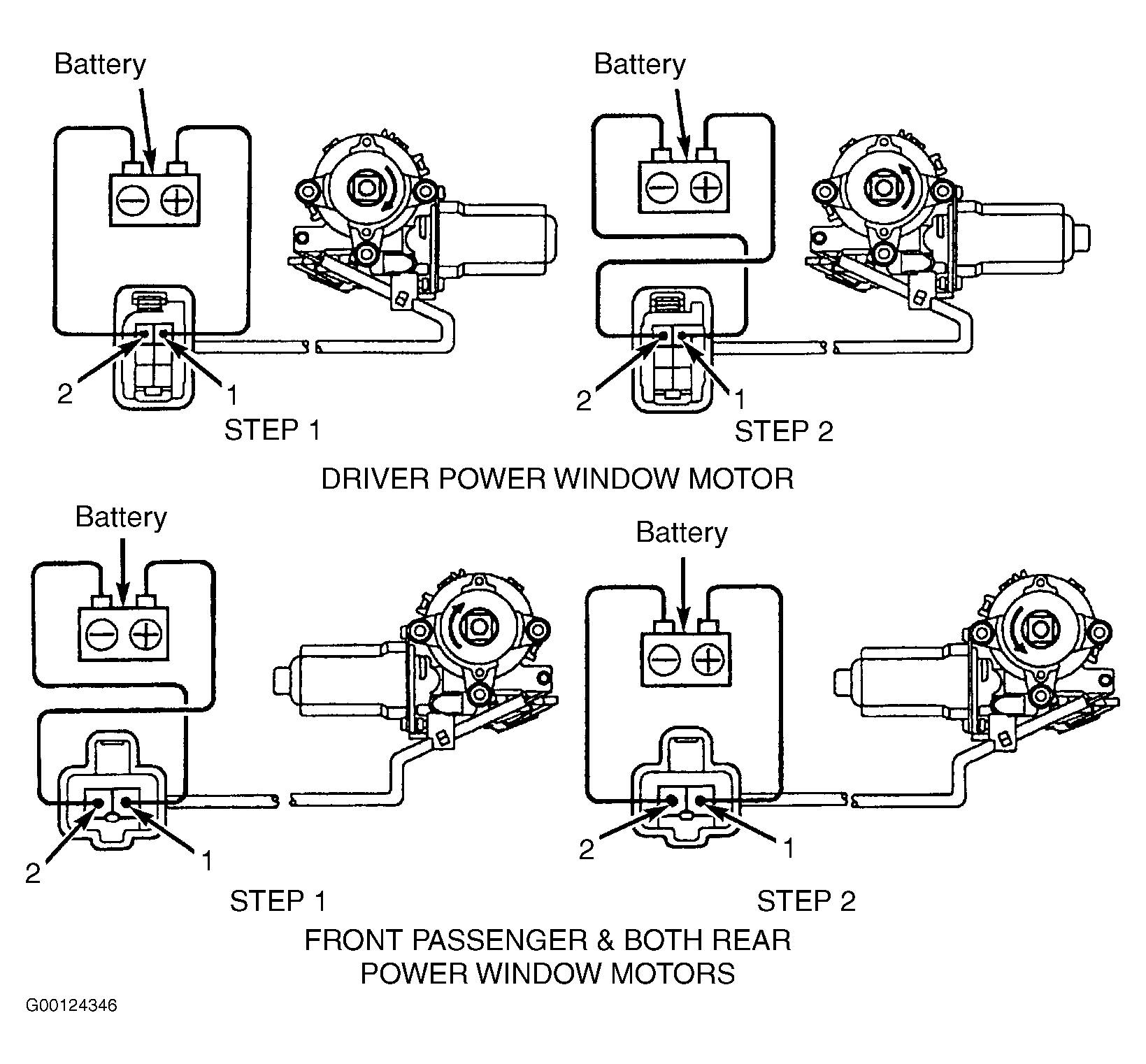 - Using jumper wires, apply battery voltage and ground to power window motor terminals No. 1 and 2 and check that power window motor rotates clockwise. See STEP 1 of Fig 1.