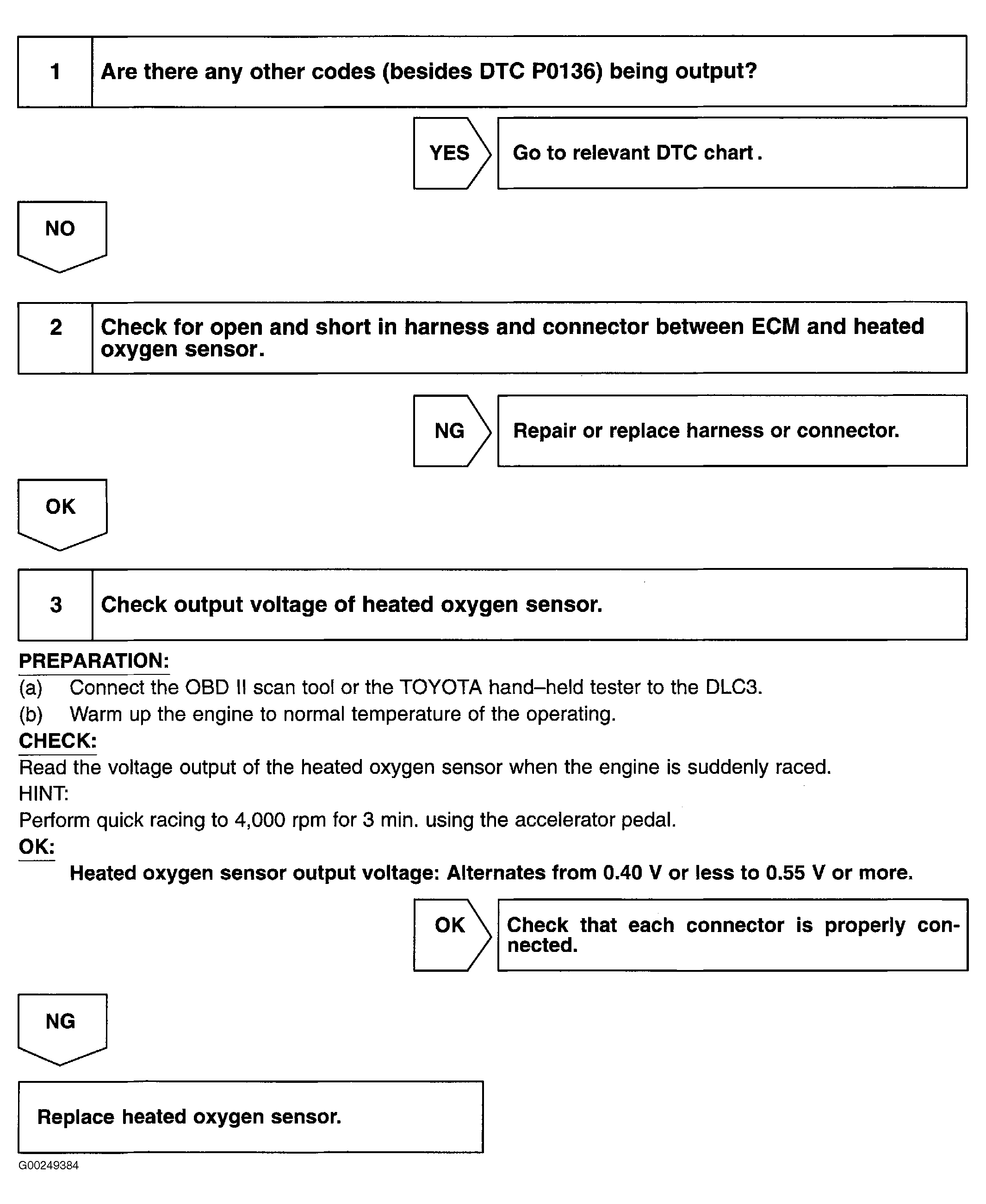 Home >> Toyota >> 2004 >> Matrix Base, FWD, Automatic >> Repair and Diagnosis >> External Pages >> Different car >> Section 130 (Engine Control System Self Diagnostics) >> Diagnostic Tests >> DTC P0136: Heated Oxygen Sensor Circuit (Bank 1 Sensor 2) >> Diagnosis & Repair