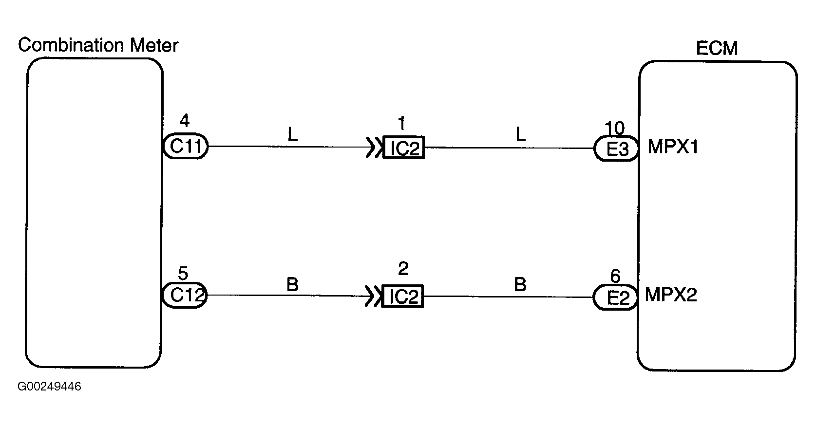 Check bus communication circuits (MPX1 and MPX2) between ECM and instrument cluster and repair as necessary. For ECM location, see Figure. For ECM connector terminal view, see Figure. For circuit wiring diagram, see Fig 1. Check instrument cluster operation and repair as necessary. See appropriate GAUGES & INSTRUMENT PANELS article in ACCESSORIES & EQUIPMENT. If combination meter is OK, check and replace ECM.