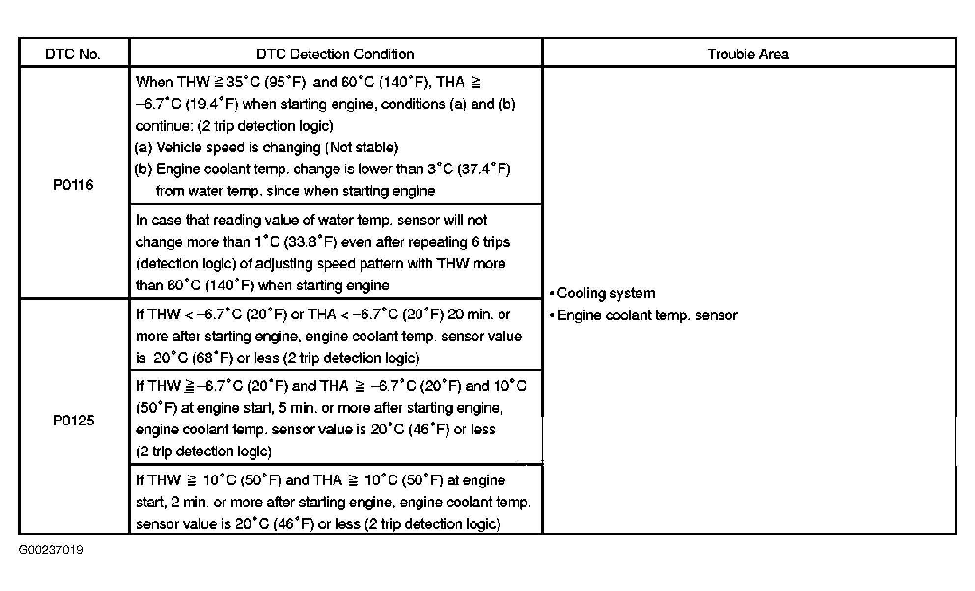 Home >> Toyota >> 2004 >> Matrix Base, FWD, Automatic >> Repair and Diagnosis >> External Pages >> Different car >> Section 135 (Engine Control System Self Diagnostics - V8) >> Diagnostic Tests >> DTC P0116: Engine Coolant Temperature Sensor Circuit Range/Performance Or DTC P0125: Insufficient Coolant Temperature For Closed Loop Fuel Control >> Possible Causes