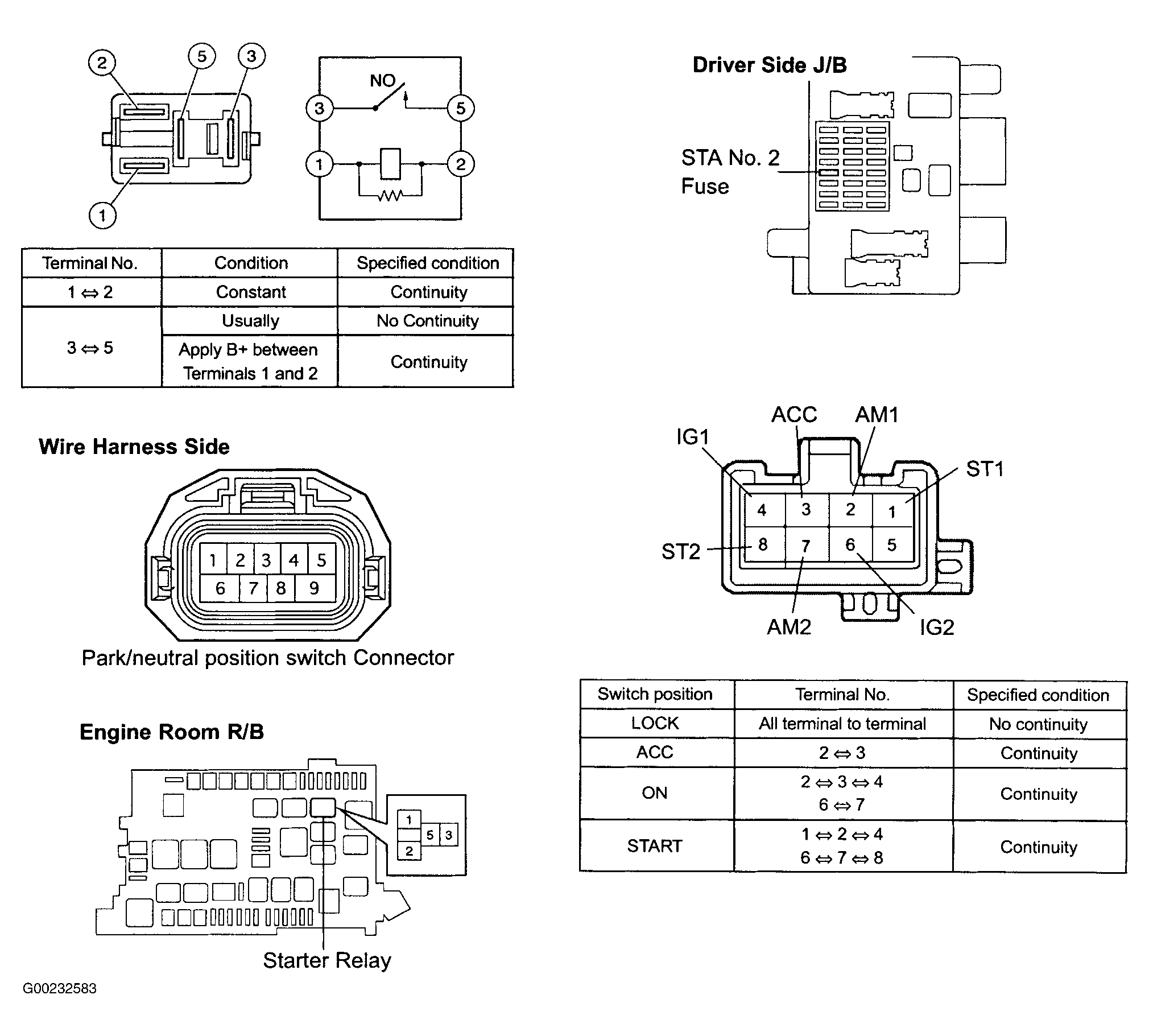 4. Check the harness and connector between the park/neutral position switch connector and starter relay. Disconnect the park/neutral position switch 9-pin connector. Remove the starter relay from the engine room relay box. Check continuity between park/neutral position switch 9-pin connector terminal No. 6 and starter relay socket terminal No. 1. See Fig 1. Continuity should exist. Then, ensure no continuity exists between ground and starter relay socket terminal No. 1 and No. 2, individually. If continuity is as specified, go to next step. If continuity is not as specified, repair or replace wire and/or connectors as necessary.