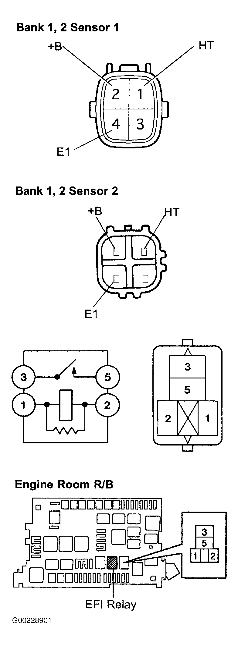 • ECM 35-pin connector E5 terminal No. 4 (HT1A) and HO2S (Bank 1 Sensor 1) terminal No. 1. Continuity should exist.