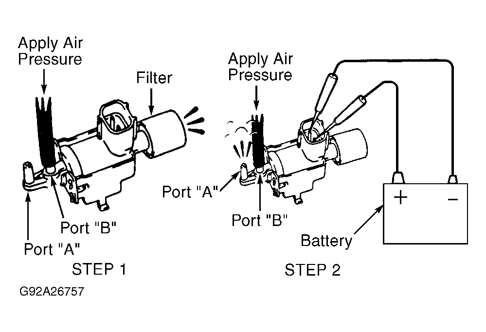 5. Apply battery voltage and ground to electrical terminals on intake air control valve VSV. Apply air pressure to port "B" on intake air control valve VSV. Ensure air flows from port "A" and not from the filter. Perform STEP 2 in illustration. See Figure. If intake air control valve VSV operates properly, reinstall intake air control valve VSV and go to next step. If intake air control valve VSV does not operate properly, replace intake air control valve VSV and recheck system operation.