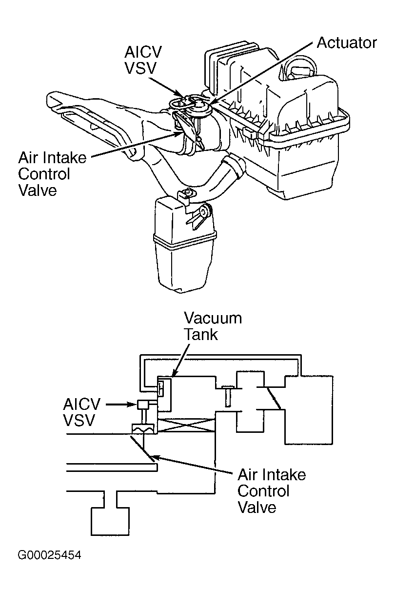 1. Disconnect electrical connector and vacuum hoses from Air Intake Control Valve (AICV) Vacuum Switching Valve (VSV). See Figure, Figure and Fig 1 .