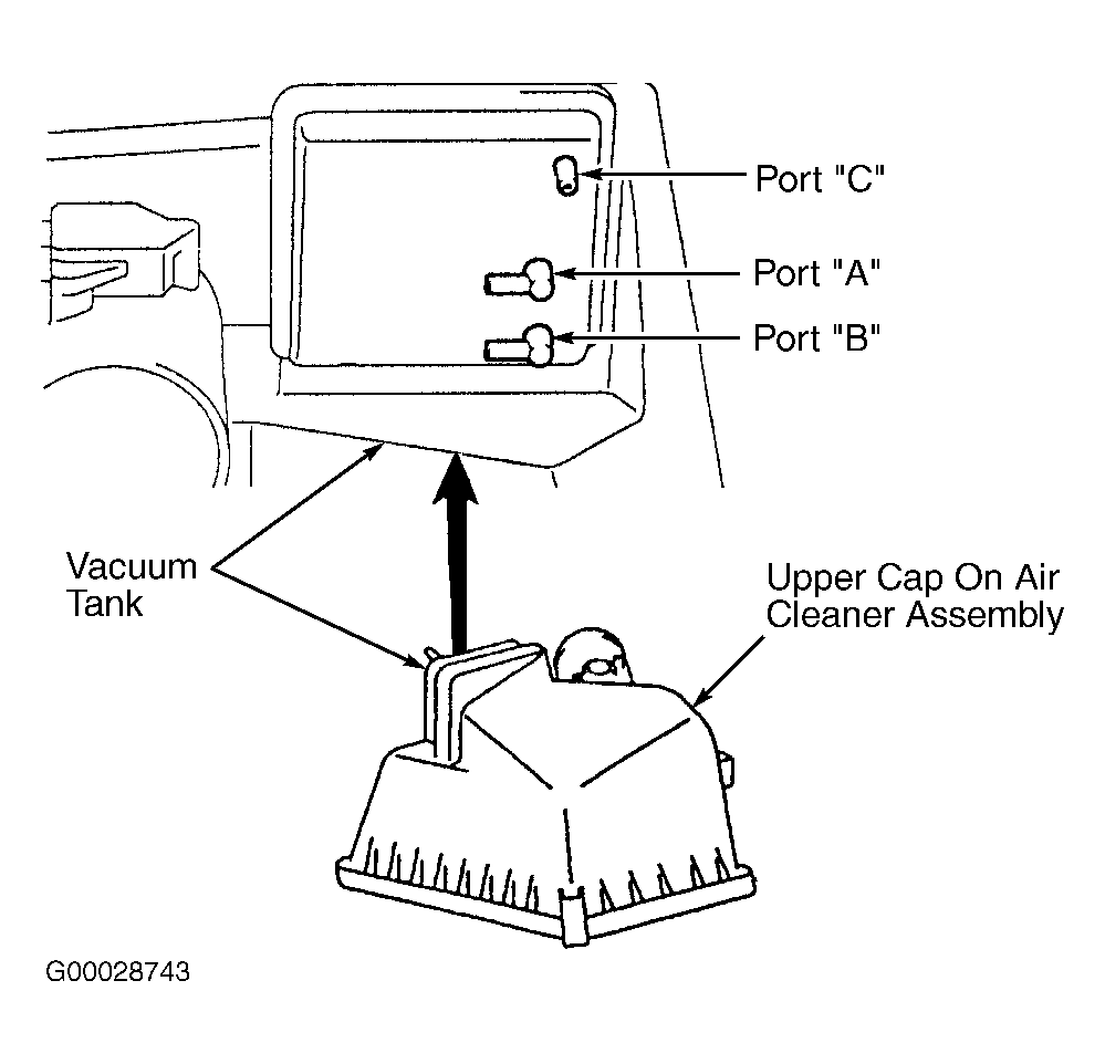 10. Plug port "C". Apply air pressure to port "A". Ensure air does not flow from port "B". Plug ports "A" and "C". Using vacuum pump, apply 18 in. Hg of vacuum to port "B". Ensure vacuum reading will hold for at least one minute. If vacuum tank is okay, reconnect vacuum hoses and go to next step. If vacuum tank is defective, replace vacuum tank or upper cap on air cleaner assembly as necessary.