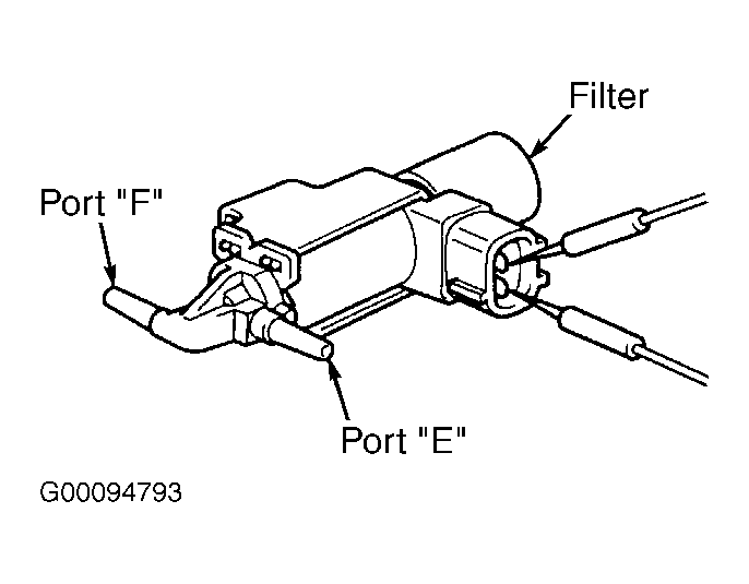 4. Apply battery voltage and ground to electrical terminals on AICV VSV. Apply air pressure to port "E" on AICV VSV. Ensure air flows from port "F". See Fig 2. If AICV VSV operates properly, reinstall electrical connector and vacuum hoses on AICV VSV. Go to next step. If AICV VSV does not operate properly, replace AICV VSV.