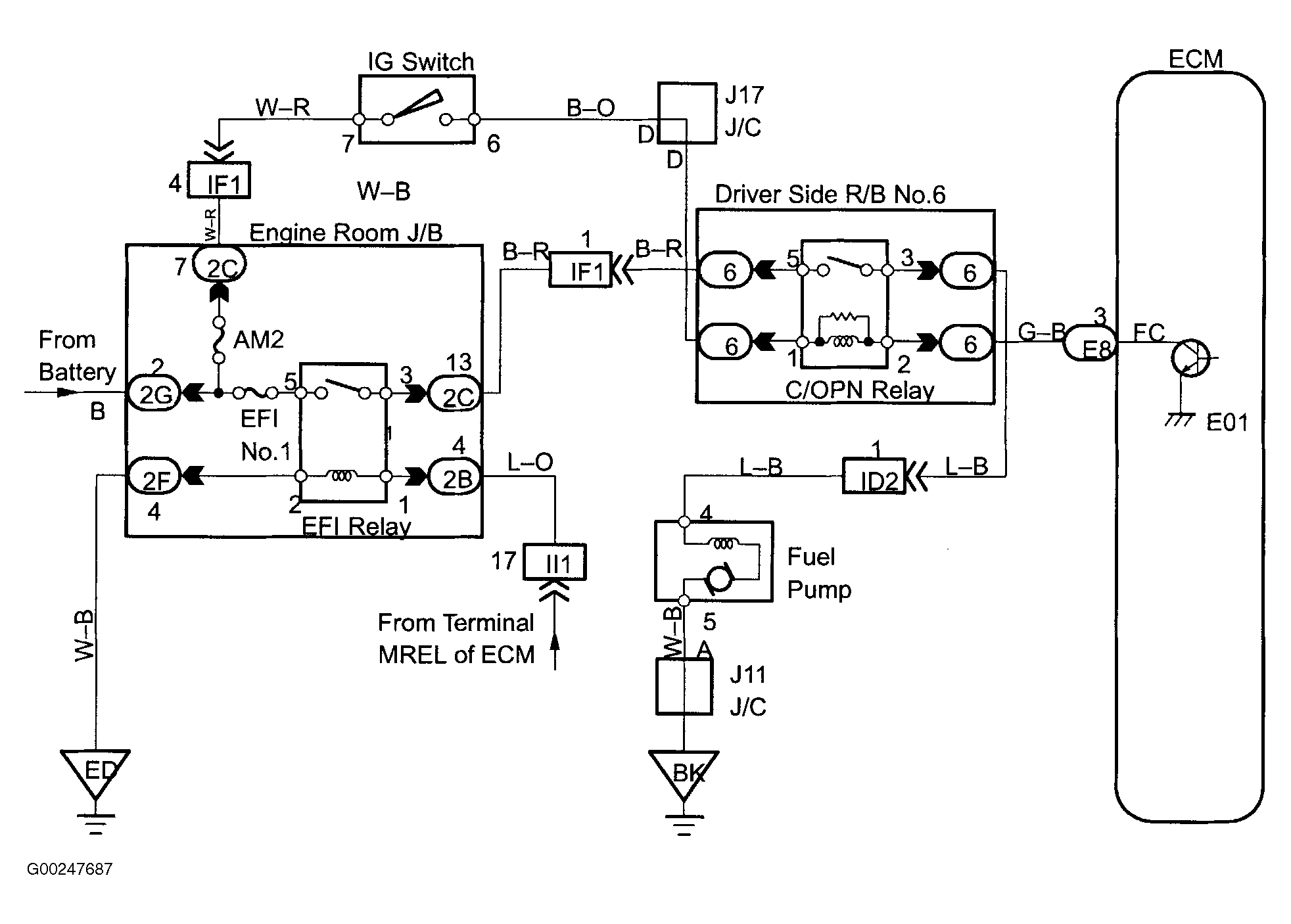 For fuel pump control circuit inspection and wiring diagram, see Fig 1-Fig 7 . To check starter signal circuit, see STARTER SIGNAL CIRCUIT . To check ECM power source circuit, see ENGINE CONTROL MODULE POWER SOURCE CIRCUIT . To check circuit opening relay, see CIRCUIT OPENING RELAY  under MODULES, MOTORS, RELAYS & SOLENOIDS. For circuit identification, see ENGINE PERFORMANCE in appropriate SYSTEM WIRING DIAGRAMS article in ELECTRICAL. To check fuel pump operation, see FUEL DELIVERY  under FUEL SYSTEMS. Before replacing ECM, check ECM connectors and ground circuits. See ENGINE CONTROL MODULE POWER & GROUND CIRCUITS  under COMPUTERIZED ENGINE CONTROLS.