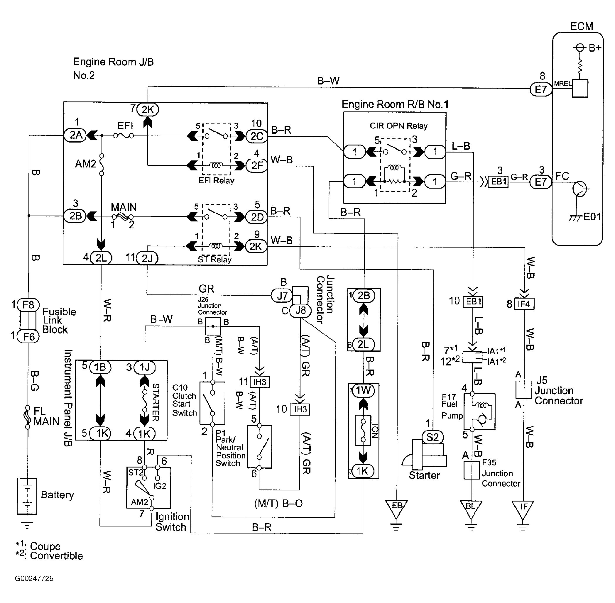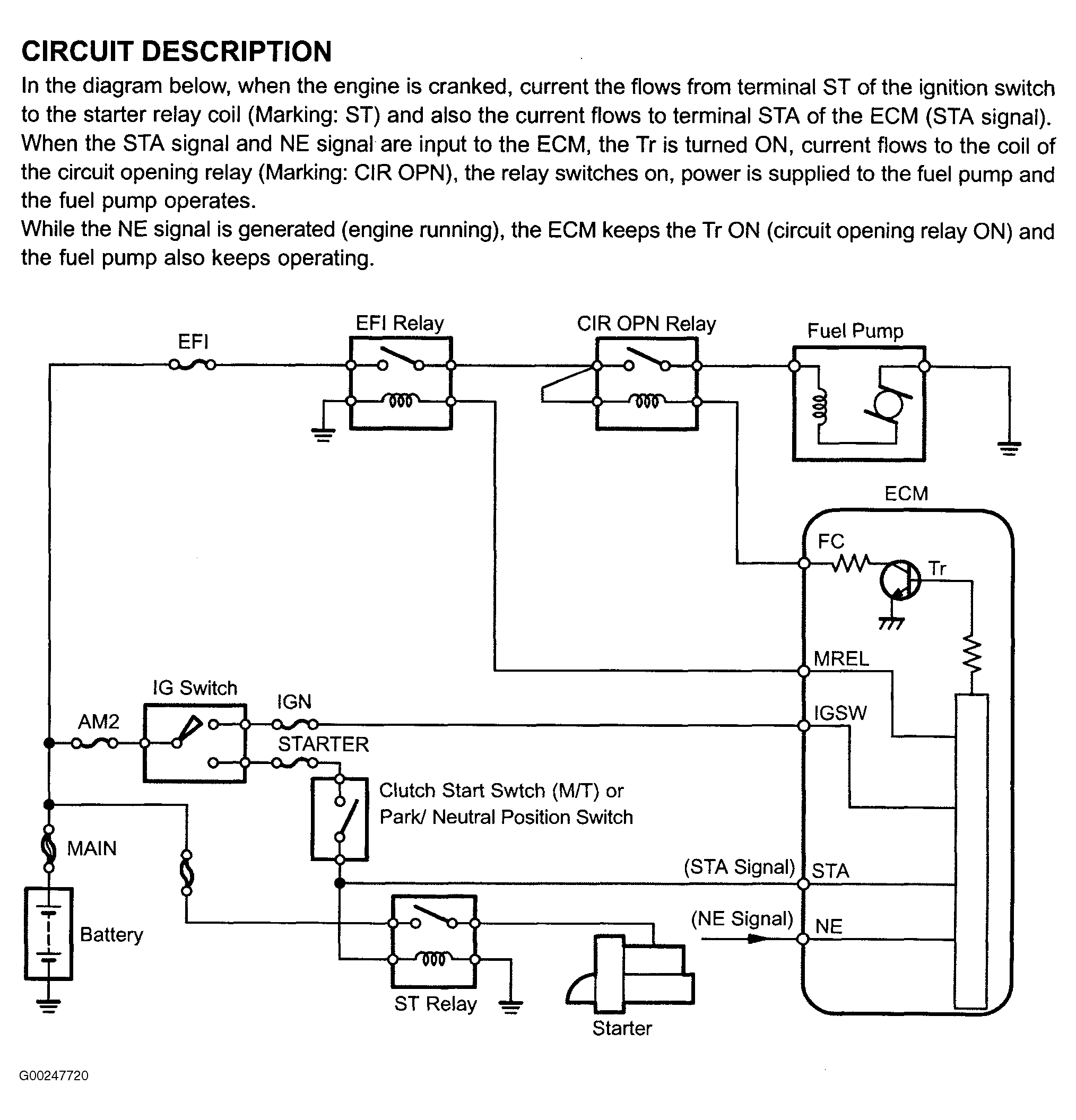 For fuel pump control circuit inspection and wiring diagram, see Fig 1-Fig 6 . To check starter signal circuit, see STARTER SIGNAL CIRCUIT . To check ECM power source circuit, see ENGINE CONTROL MODULE POWER SOURCE CIRCUIT . To check circuit opening relay, see CIRCUIT OPENING RELAY under MODULES, MOTORS, RELAYS & SOLENOIDS. For circuit identification, see ENGINE PERFORMANCE in appropriate SYSTEM WIRING DIAGRAMS article in ELECTRICAL. To check fuel pump operation, see FUEL DELIVERY under FUEL SYSTEMS. Before replacing ECM, check ECM connectors and ground circuits. See ENGINE CONTROL MODULE POWER & GROUND CIRCUITS under COMPUTERIZED ENGINE CONTROLS.