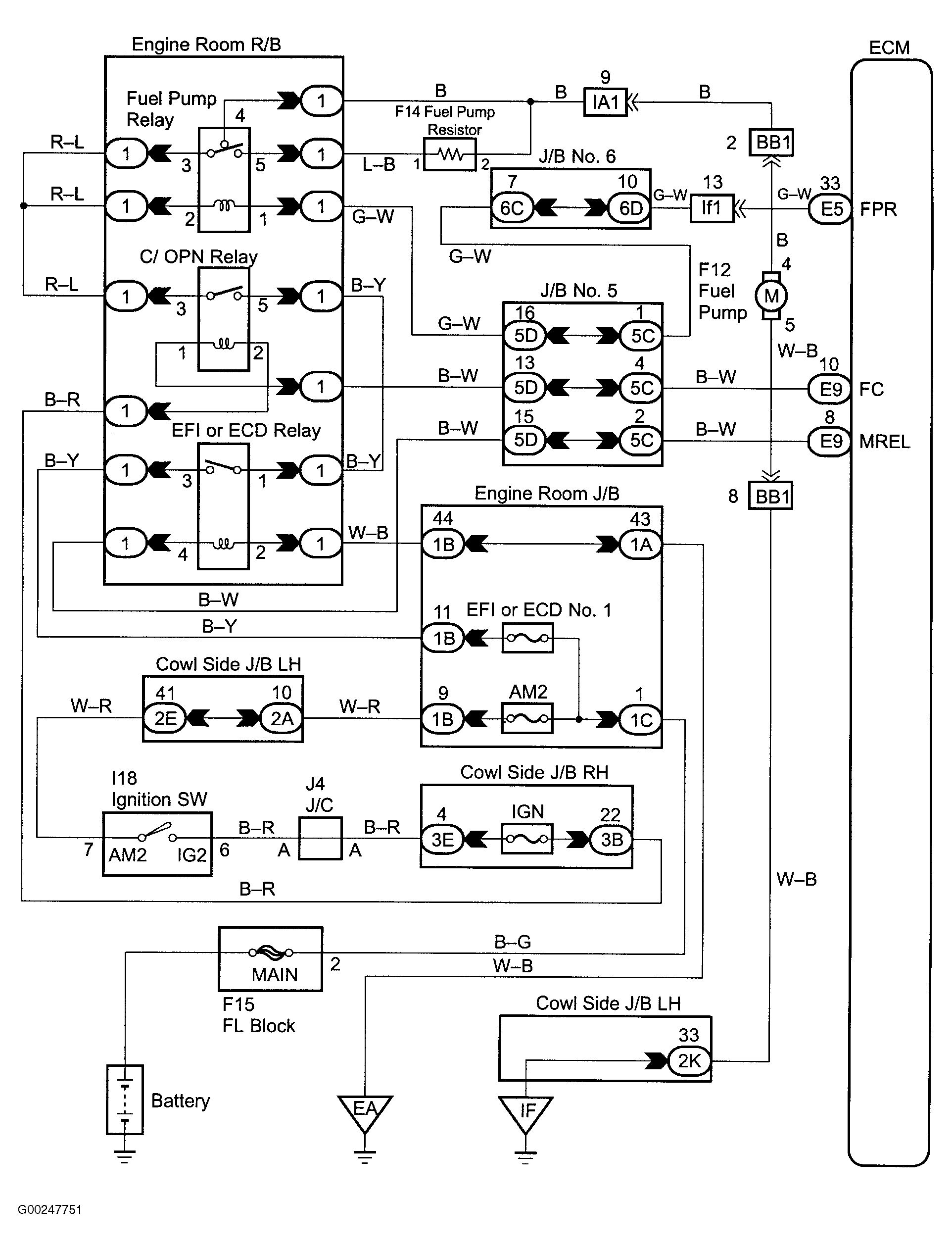 For fuel pump control circuit inspection and wiring diagram, see Fig 1-Fig 7 . To check fuel pump relay, see FUEL PUMP RELAY  under MODULES, MOTORS, RELAYS & SOLENOIDS. To check fuel pump operation, see FUEL DELIVERY  under FUEL SYSTEMS. To check circuit opening relay, see CIRCUIT OPENING RELAY  under MODULES, MOTORS, RELAYS & SOLENOIDS. For circuit identification, see ENGINE PERFORMANCE in appropriate SYSTEM WIRING DIAGRAMS article in ELECTRICAL. To check fuel pump resistor operation, see FUEL DELIVERY  under FUEL SYSTEMS.
