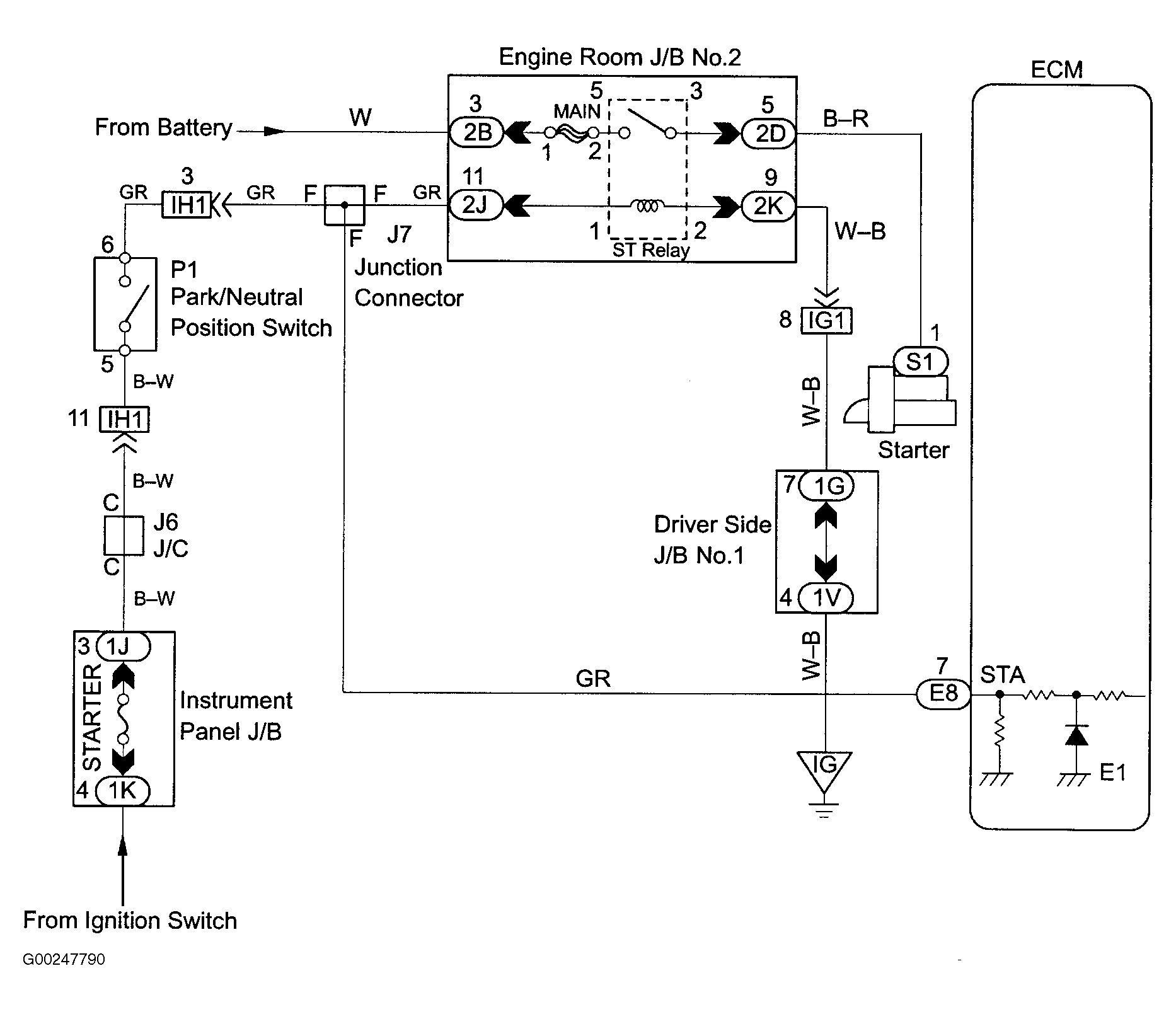For starter signal circuit inspection and wiring diagram, see Fig 1-Fig 4 . For circuit identification, see ENGINE PERFORMANCE in appropriate SYSTEM WIRING DIAGRAMS article in ELECTRICAL. Before replacing ECM, check ECM connectors and ground circuits. See ENGINE CONTROL MODULE POWER & GROUND CIRCUITS  under COMPUTERIZED ENGINE CONTROLS.