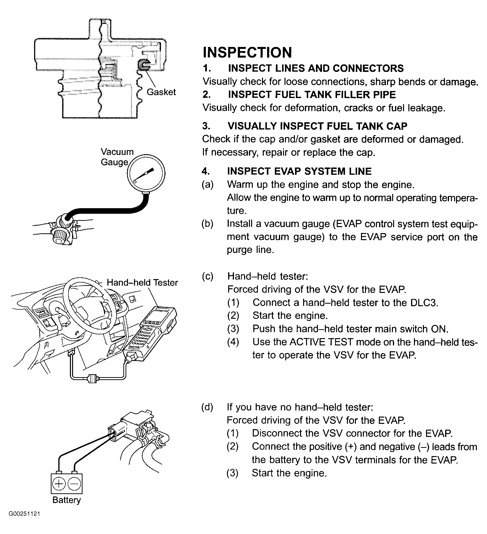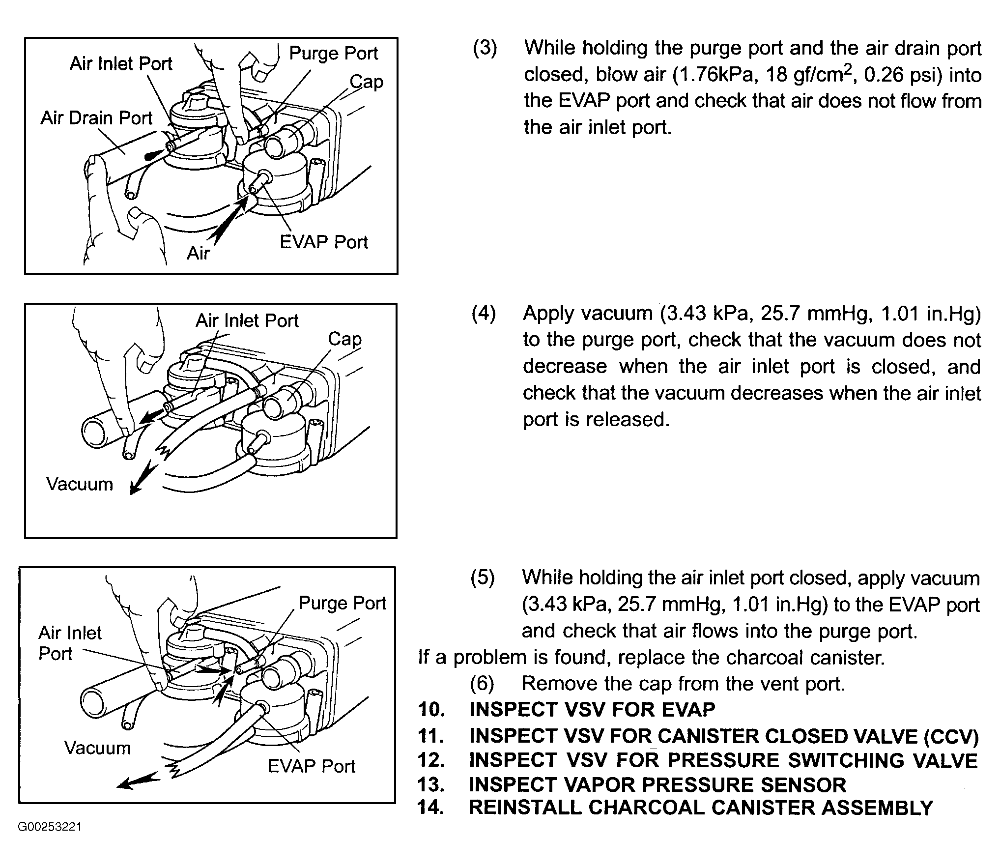For fuel EVAP system test, see Fig 1-Fig 5 . To inspect VSV for EVAP, see EVAP VACUUM SWITCHING VALVE (ALL MODELS) . To inspect VSV for Canister Closed Valve, see CANISTER CLOSED VALVE VACUUM SWITCHING VALVE (AVALON, CAMRY, CAMRY SOLARA, HIGHLANDER & SIENNA) . To inspect VSV for pressure switching valve, see PRESSURE SWITCHING VALVE VACUUM SWITCHING VALVE (AVALON, CAMRY, CAMRY SOLARA, HIGHLANDER, LAND CRUISER, SEQUOIA, SIENNA & TACOMA) . To inspect vapor pressure sensor, see VAPOR PRESSURE SENSOR (SIENNA) .