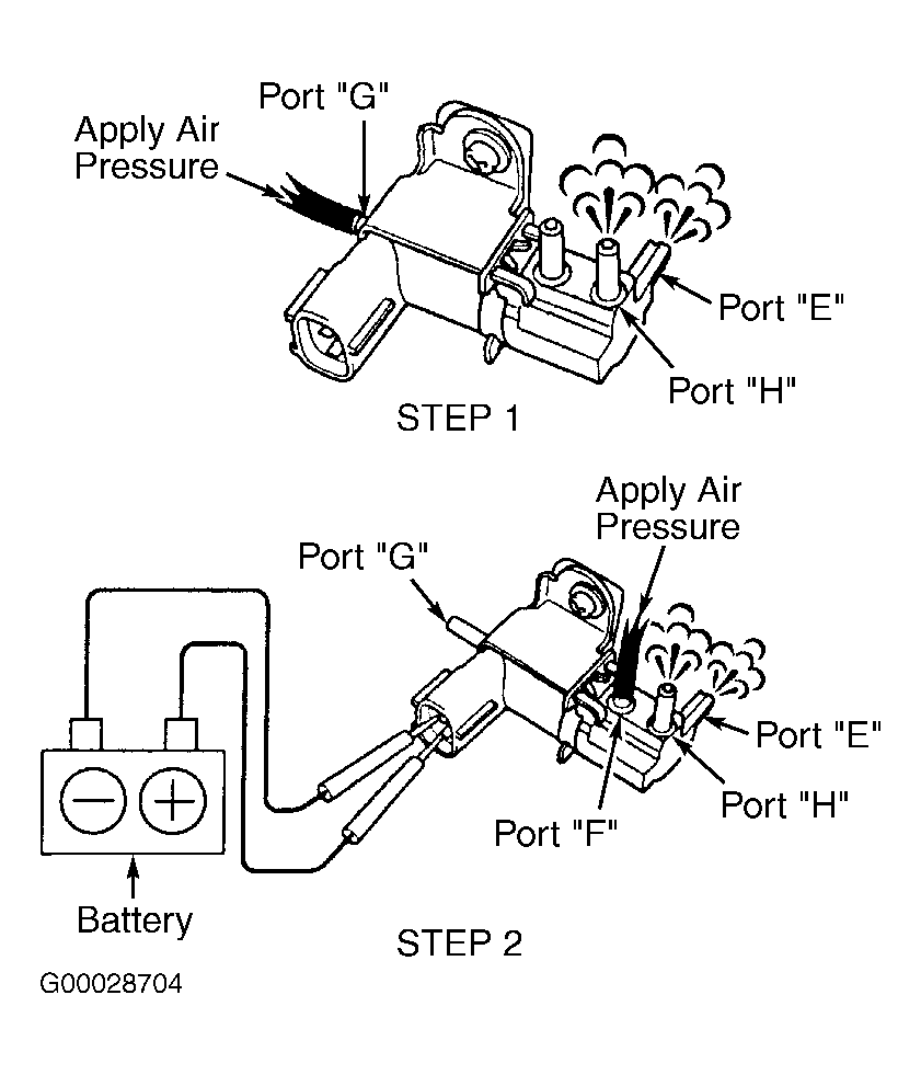 5. To check ACM VSV operation, apply air pressure to port "G" on ACM VSV. Ensure air flows from ports "E" and "H". Perform STEP 1 in illustration. See Fig 3. Apply battery voltage and ground to electrical terminals on ACM VSV. Apply air pressure to port "F" on ACM VSV. Ensure air flows from ports "E" and "H". Perform STEP 2 in illustration. See Fig 3. If ACM VSV operates properly, reinstall ACM VSV. If ACM VSV does not operate properly, replace ACM VSV.