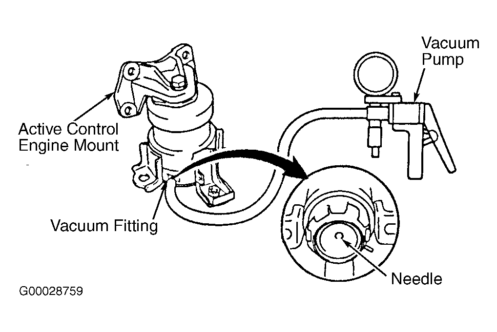 2. Disconnect vacuum hose from vacuum fitting on active control engine mount and connect vacuum pump to vacuum fitting. See Fig 2. Using vacuum pump, apply 25.0 in. Hg of vacuum to active control engine mount for at least one minute and check that no change exists in the needle movement. Needle is located at the bottom of active engine control mount. Check for signs of fluid leakage on active engine mount. If active control engine mount does not operate as specified or signs of fluid leakage exist, replace active control engine mount.